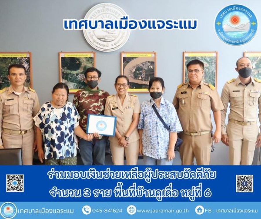 นางสาวกัลยา ลักษณะงาม นายกเทศมนตรีเมืองแจระแม พร้อมด้วยนายจรูญ ขวัญหวัญ ปลัดเทศบาล พันจ่าเอกธนพล ผูกรักษ์ หัวหน้าฝ่ายป้องกันและบรรเทาสาธารณภัย และเจ้าหน้าที่งานป้องกันและบรรเทาสาธารณภัย ร่วมมอบเงินช่วยเหลือผู้ประสบอัคคีภัย เพื่อเป็นการบรรเทาความเดือดร้อนของผู้ประสบภัย เหตุอัคคีภัยเมื่อวันที่ 3 มิถุนายน 2567 ที่ผ่านมา พื้นที่เกิดเหตุบ้านคูเดื่อ หมู่ที่ 6 ตำบลแจระแม อำเภอเมืองอุบลราชธานี จังหวัดอุบลราชธานี โดยมีผู้ที่ได้รับการช่วยเหลือจำนวน 3 ราย ดังนี้ 1.น.ส.ระมัย เจริญชัย บ้านเลขที่ 3 หมู่ที่ 6 ตำบลแจระแม อำเภอเมืองอุบลราชธานี (เสียหายทั้งหลัง) 2.นางถวิล เจริญชัย บ้านเลขที่ 84 หมู่ที่ 6 ตำบลแจระแม อำเภอเมืองอุบลราชธานี (เสียหายบางส่วน) 3.นายอภิวัฒน์ เจริญชัย บ้านเลขที่ 213 หมู่ที่ 6 ตำบลแจระแม อำเภอเมืองอุบลราชธานี (เสียหายบางส่วน) โดยผู้ประสบอัคคีภัยที่ได้รับการช่วยเหลือดังกล่าวฯ ผ่านมติการเห็นชอบของคณะกรรมการช่วยเหลือประชาชนของเทศบาลเมืองแจระแม ได้พิจารณาช่วยเหลือประชาชนโดยถือปฏิบัติตามระเบียบกระทรวงมหาดไทยว่าด้วยค่าใช้จ่ายเพื่อช่วยเหลือประชาชนตามอำนาจหน้าที่ขององค์กรปกครองส่วนท้องถิ่น พ.ศ. 2566 ในวันศุกร์ที่ 26 มิถุนายน 2567 ณ ห้องประชุมสภาเทศบาลเมืองแจระแม ตำบลแจระแม อำเภอเมืองอุบลราชธานี จังหวัดอุบลราชธานี