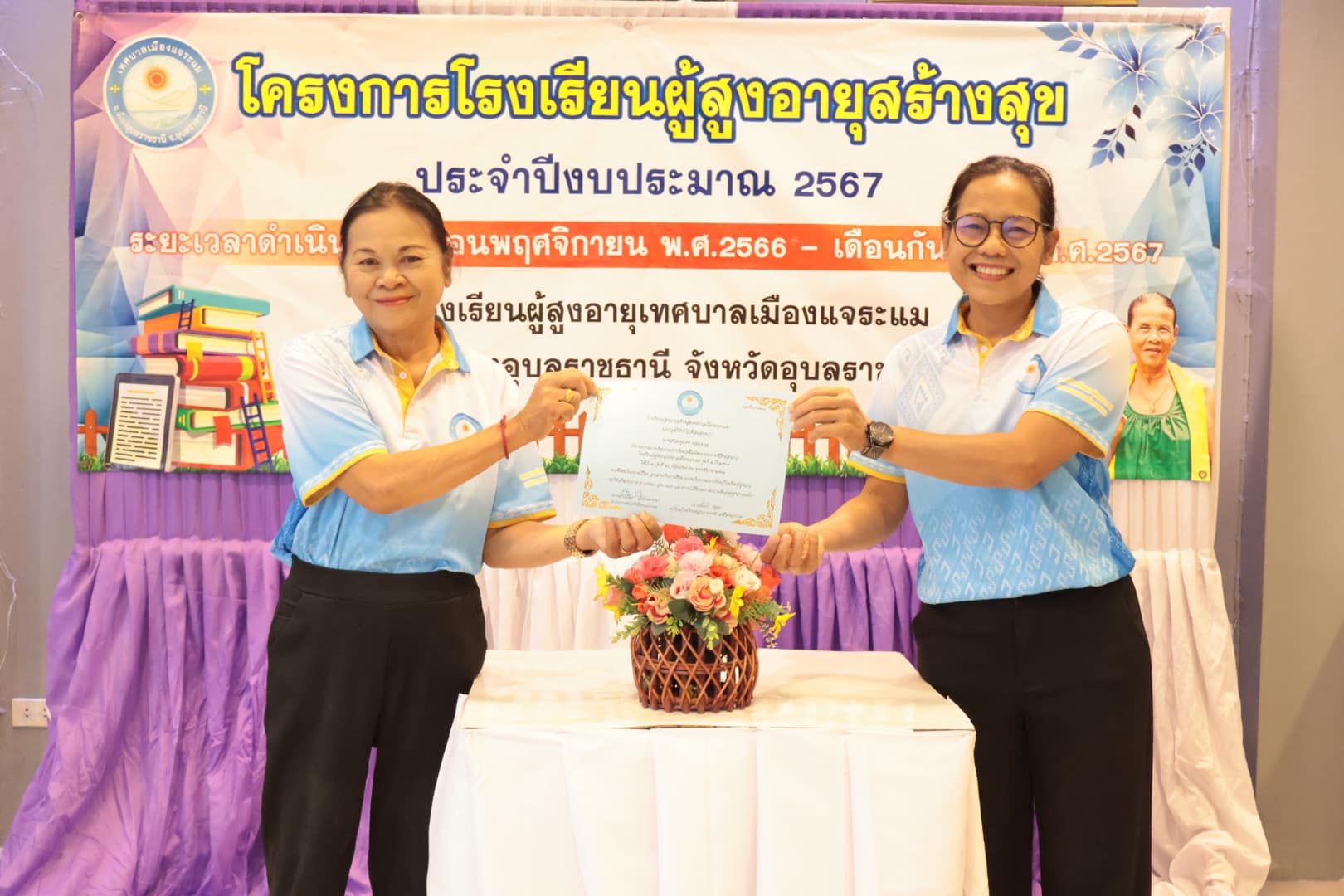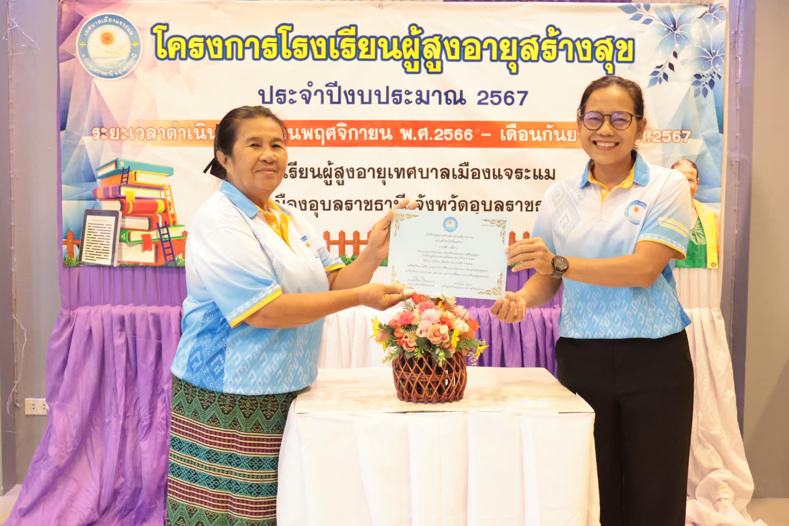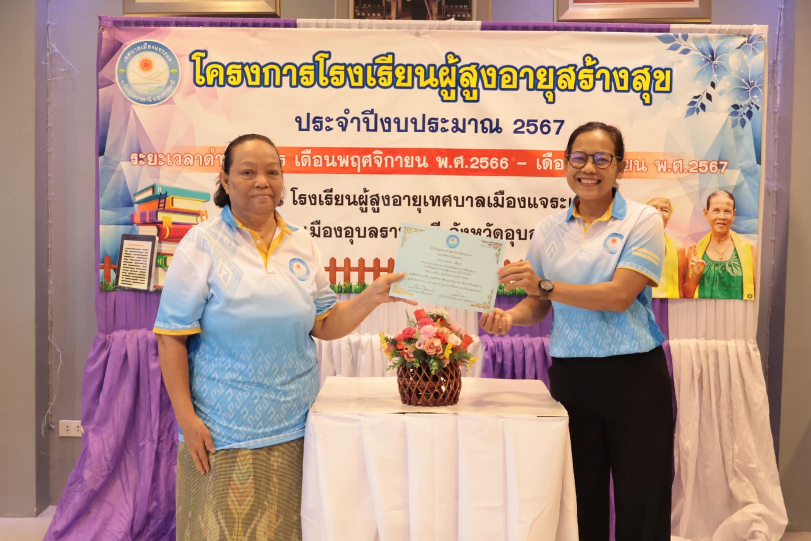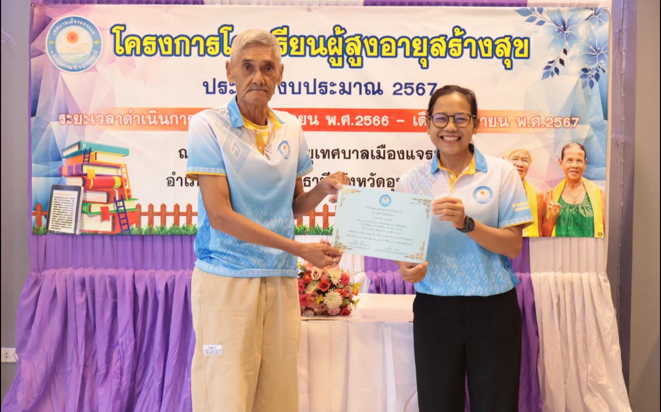 นางสาวกัลยา ลักษณะงาม นายกเทศมนตรีเมืองแจระแม พร้อมด้วยคณะผู้บริหารเทศบาล นายจรูญ ขวัญหวัญ ปลัดเทศบาล หัวหน้าส่วนราชการ พนักงานเทศบาลและเจ้าหน้าที่ ร่วมดำเนินกิจกรรมโรงเรียนผู้สูงอายุสร้างสุข รุ่นที่ 2 ครั้งที่ 11 ประจำปีงบประมาณ พ.ศ. 2567 โดยมีกิจกรรม ดังนี้ เวลา 09.00 น. บรรยาย หัวข้อการนวดบรรเทาอาการปวดเฉพาะส่วน การบริหารป้องกันข้อเข่าเสื่อมในผู้สูงอายุ วิทยากรโดย รพ.สต.หนองแก เวลา 11.00 น. พิธีมอบวุฒิบัตร จบการศึกษาของนักเรียนโรงเรียนผู้สูงอายุ รุ่นที่ 2 ประจำปี 2567 โดยเริ่มการเรียนการสอนตั้งแต่วันที่ 17 พฤศจิกายน 2566 จนจบหลักสูตรในวันที่ 20 กันยายน 2567 ซึ่งได้ผ่านการเรียนรู้อันแสดงถึงความอุตสาหะ ความตั้งใจเรียนตลอดหลักสูตร เพื่อเป็นการพัฒนาคุณภาพชีวิตและการเรียนรู้ตลอดชีวิตของผู้สูงอายุ สร้างเสริมสุขภาพที่ดีของผู้สูงอายุทั้งทางด้านร่างกายจิตใจอารมณ์และสังคม ณ ห้องประชุมสภาเทศบาลเมืองแจระแม อำเภอเมืองอุบลราชธานี จังหวัดอุบลราชธานี