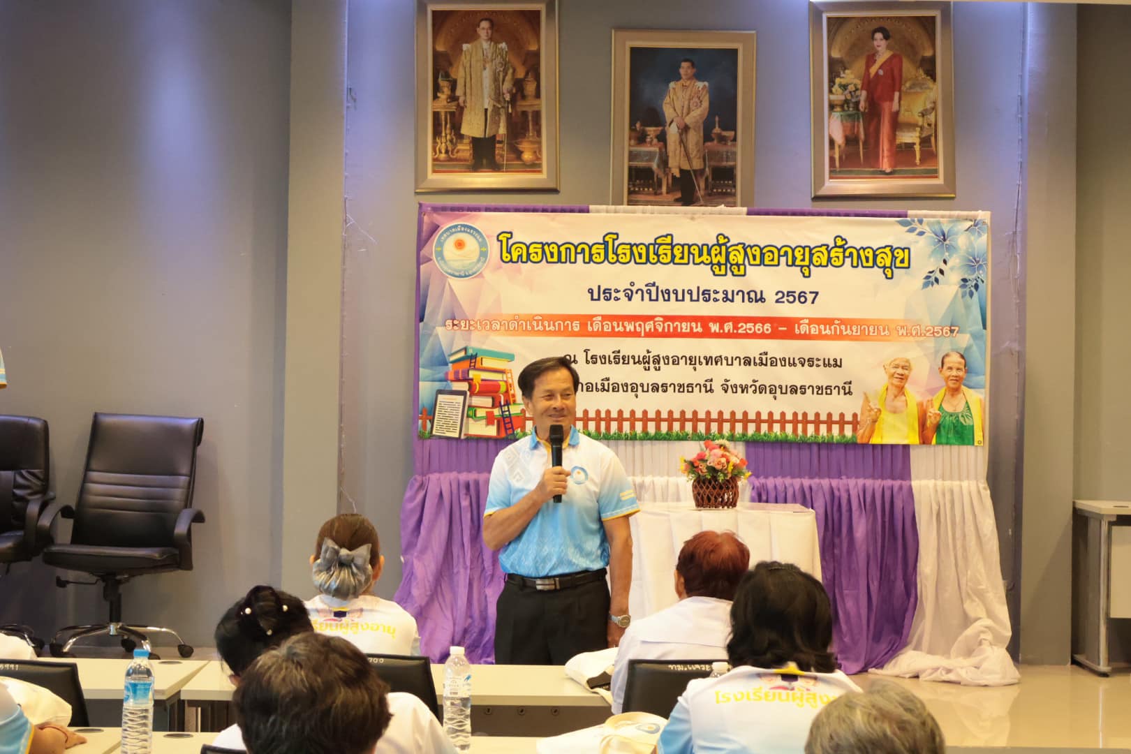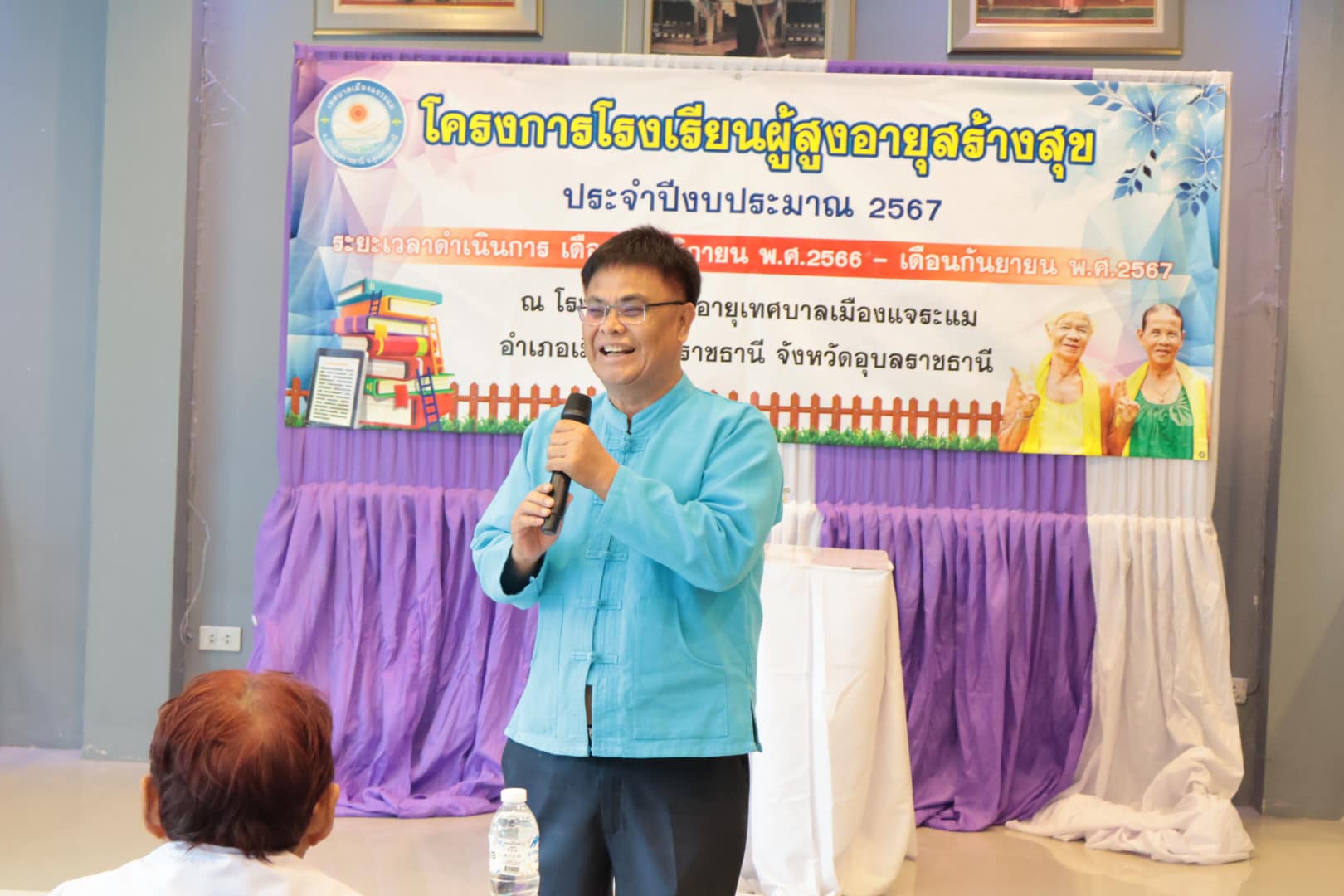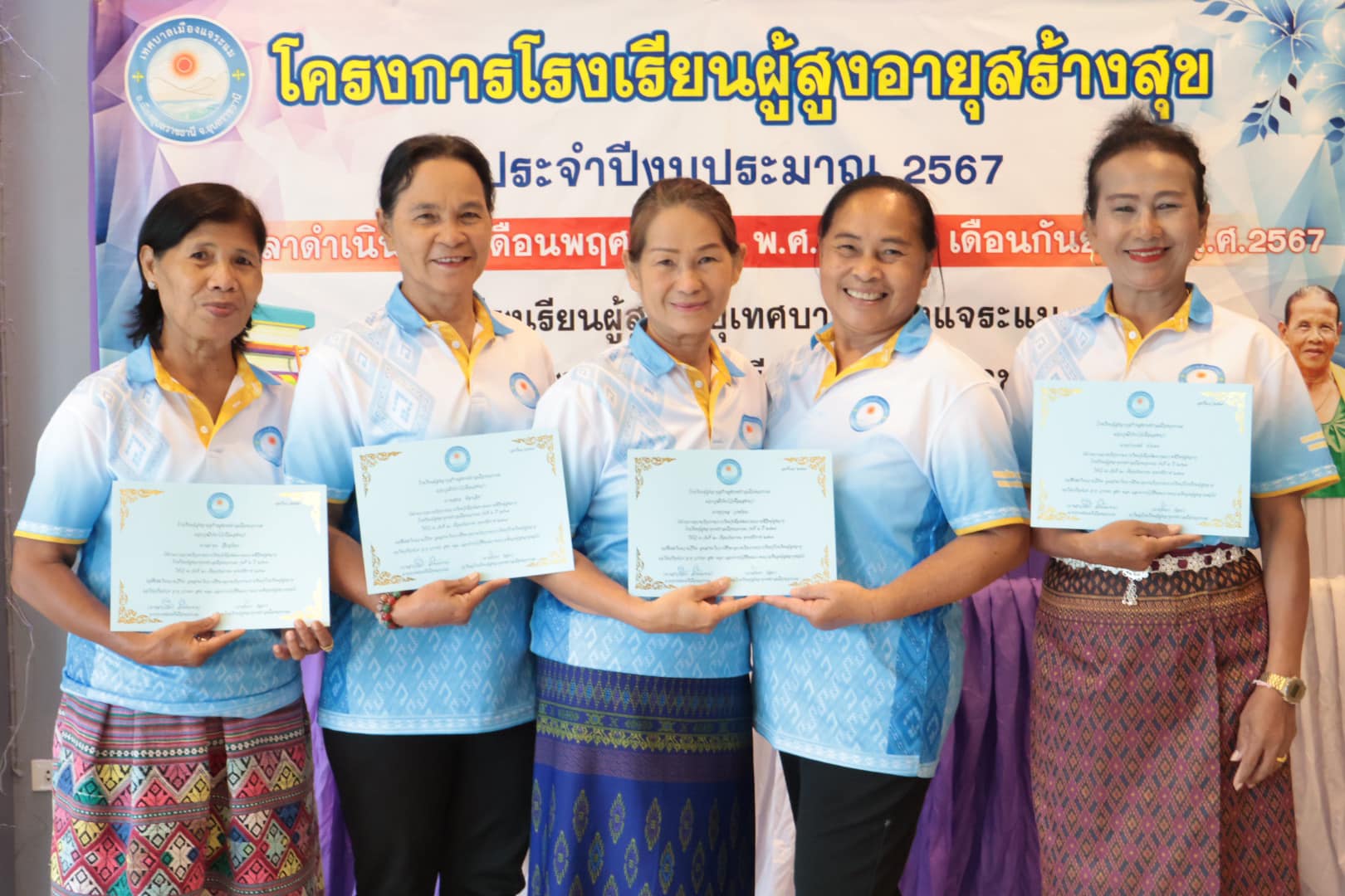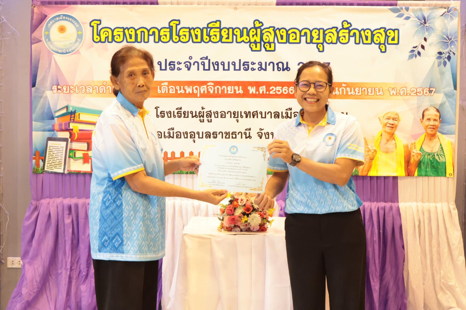 นางสาวกัลยา ลักษณะงาม นายกเทศมนตรีเมืองแจระแม พร้อมด้วยคณะผู้บริหารเทศบาล นายจรูญ ขวัญหวัญ ปลัดเทศบาล หัวหน้าส่วนราชการ พนักงานเทศบาลและเจ้าหน้าที่ ร่วมดำเนินกิจกรรมโรงเรียนผู้สูงอายุสร้างสุข รุ่นที่ 2 ครั้งที่ 11 ประจำปีงบประมาณ พ.ศ. 2567 โดยมีกิจกรรม ดังนี้ เวลา 09.00 น. บรรยาย หัวข้อการนวดบรรเทาอาการปวดเฉพาะส่วน การบริหารป้องกันข้อเข่าเสื่อมในผู้สูงอายุ วิทยากรโดย รพ.สต.หนองแก เวลา 11.00 น. พิธีมอบวุฒิบัตร จบการศึกษาของนักเรียนโรงเรียนผู้สูงอายุ รุ่นที่ 2 ประจำปี 2567 โดยเริ่มการเรียนการสอนตั้งแต่วันที่ 17 พฤศจิกายน 2566 จนจบหลักสูตรในวันที่ 20 กันยายน 2567 ซึ่งได้ผ่านการเรียนรู้อันแสดงถึงความอุตสาหะ ความตั้งใจเรียนตลอดหลักสูตร เพื่อเป็นการพัฒนาคุณภาพชีวิตและการเรียนรู้ตลอดชีวิตของผู้สูงอายุ สร้างเสริมสุขภาพที่ดีของผู้สูงอายุทั้งทางด้านร่างกายจิตใจอารมณ์และสังคม ณ ห้องประชุมสภาเทศบาลเมืองแจระแม อำเภอเมืองอุบลราชธานี จังหวัดอุบลราชธานี