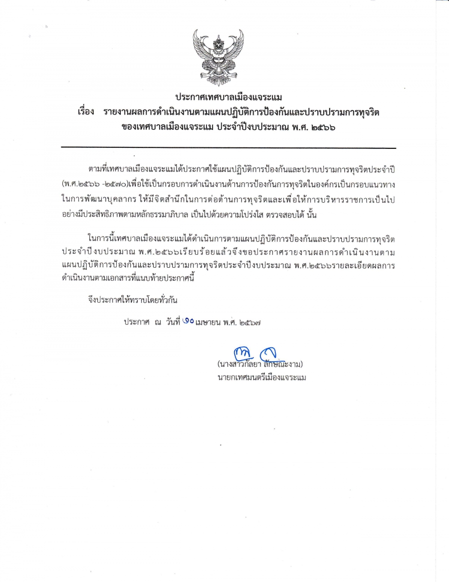 วันศุกร์, 19 เมษายน 2567 11:10รายงานผลการดำเนินงานตามแผนปฏิบัติการป้องกันการทุจริต ของเทศบาลเมืองแจระแม พ.ศ. 2566 รอบ 12 เดือน