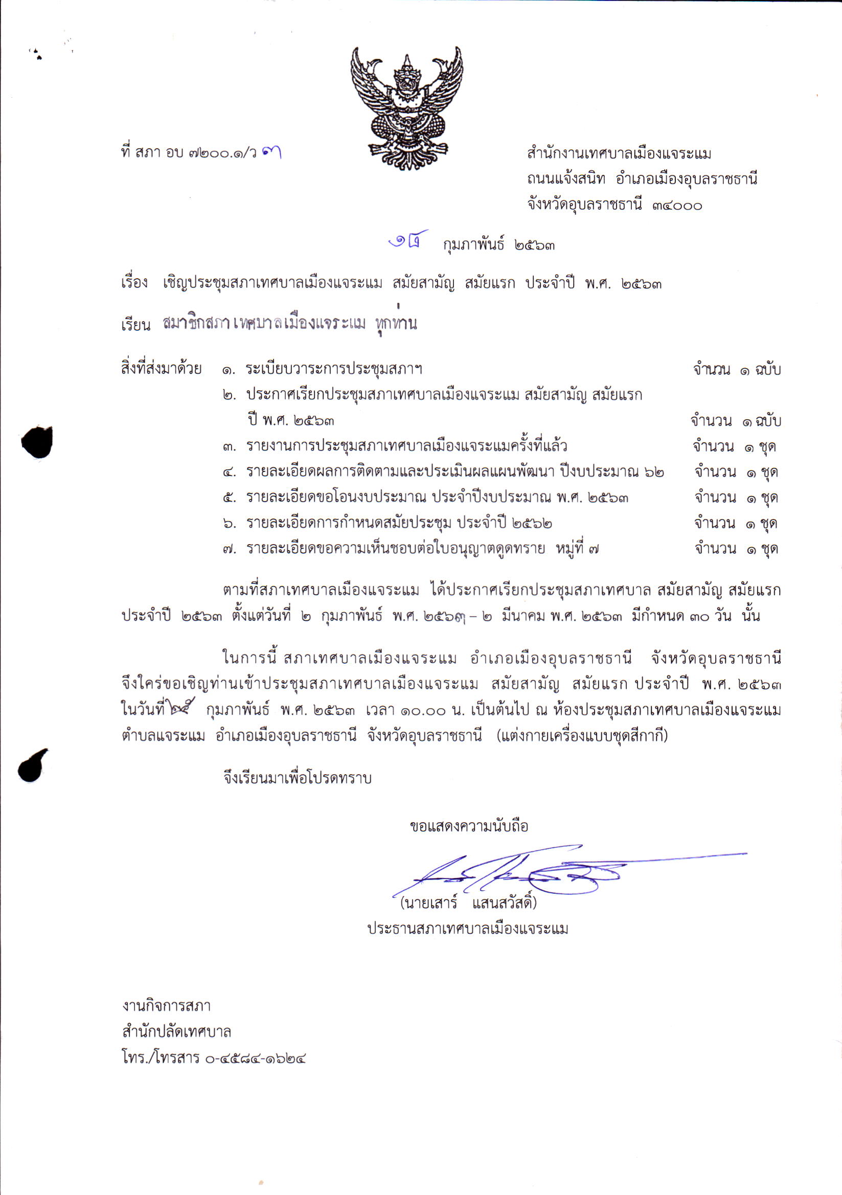 เชิญประชุมสภาเทศบาลเมืองแจระแมสมัยสามัญ สมัยแรก ประจำปี พ.ศ.2563