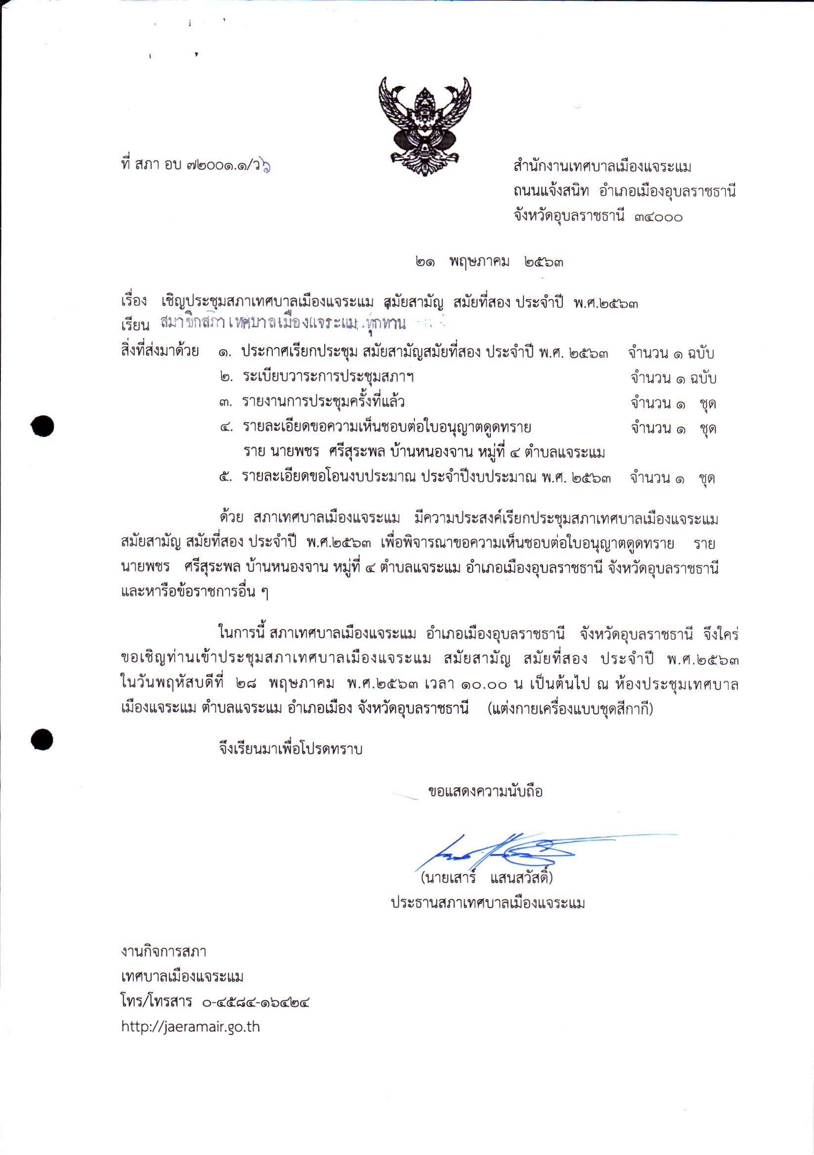เชิญประชุมสภาเทศบาลเมืองแจระแมสมัยสามัญ สมัยที่สอง ประจำปี พ.ศ.2563