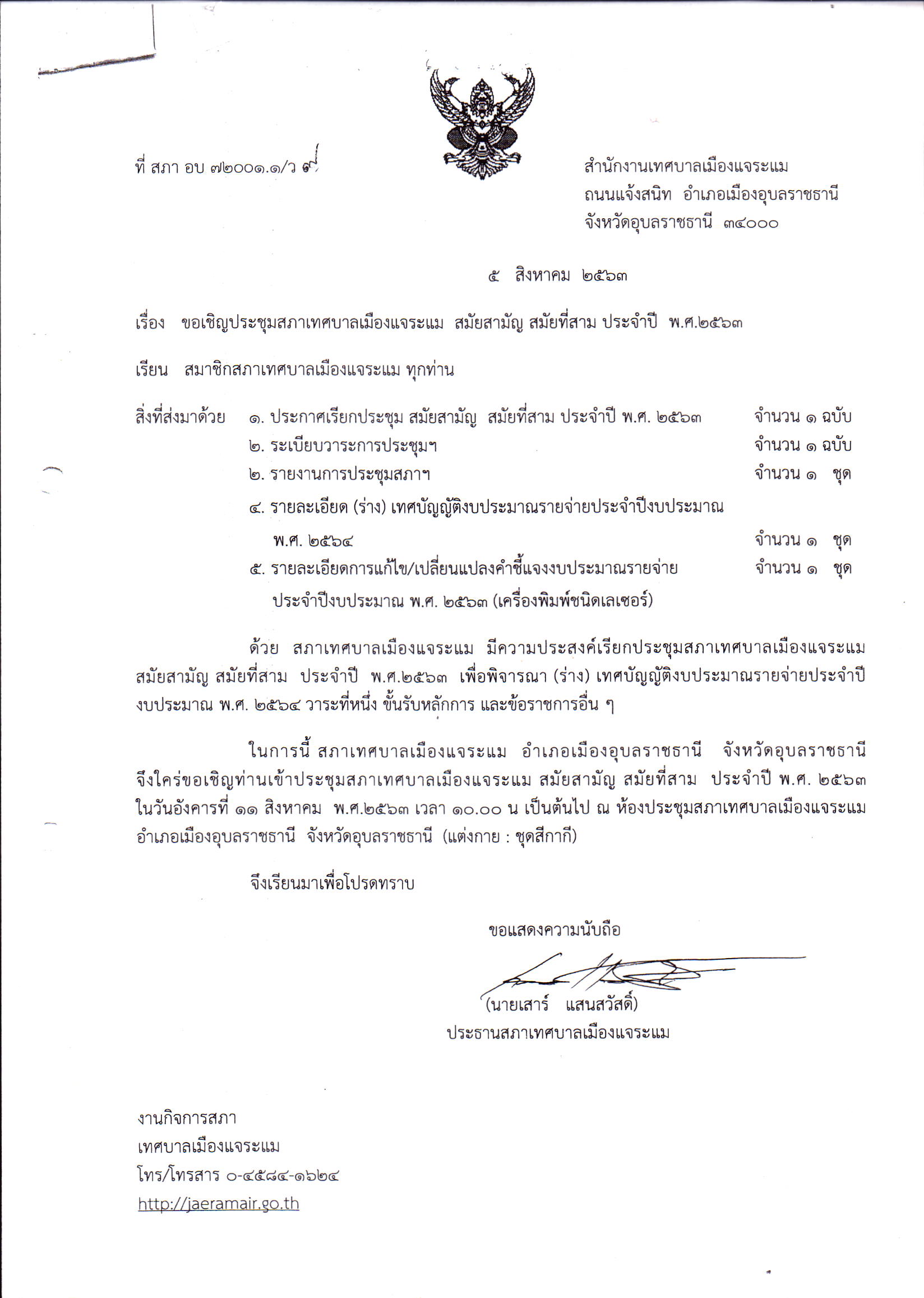 เชิญประชุมสภาเทศบาลเมืองแจระแมสมัยสามัญ สมัยที่สาม ประจำปี พ.ศ.2563