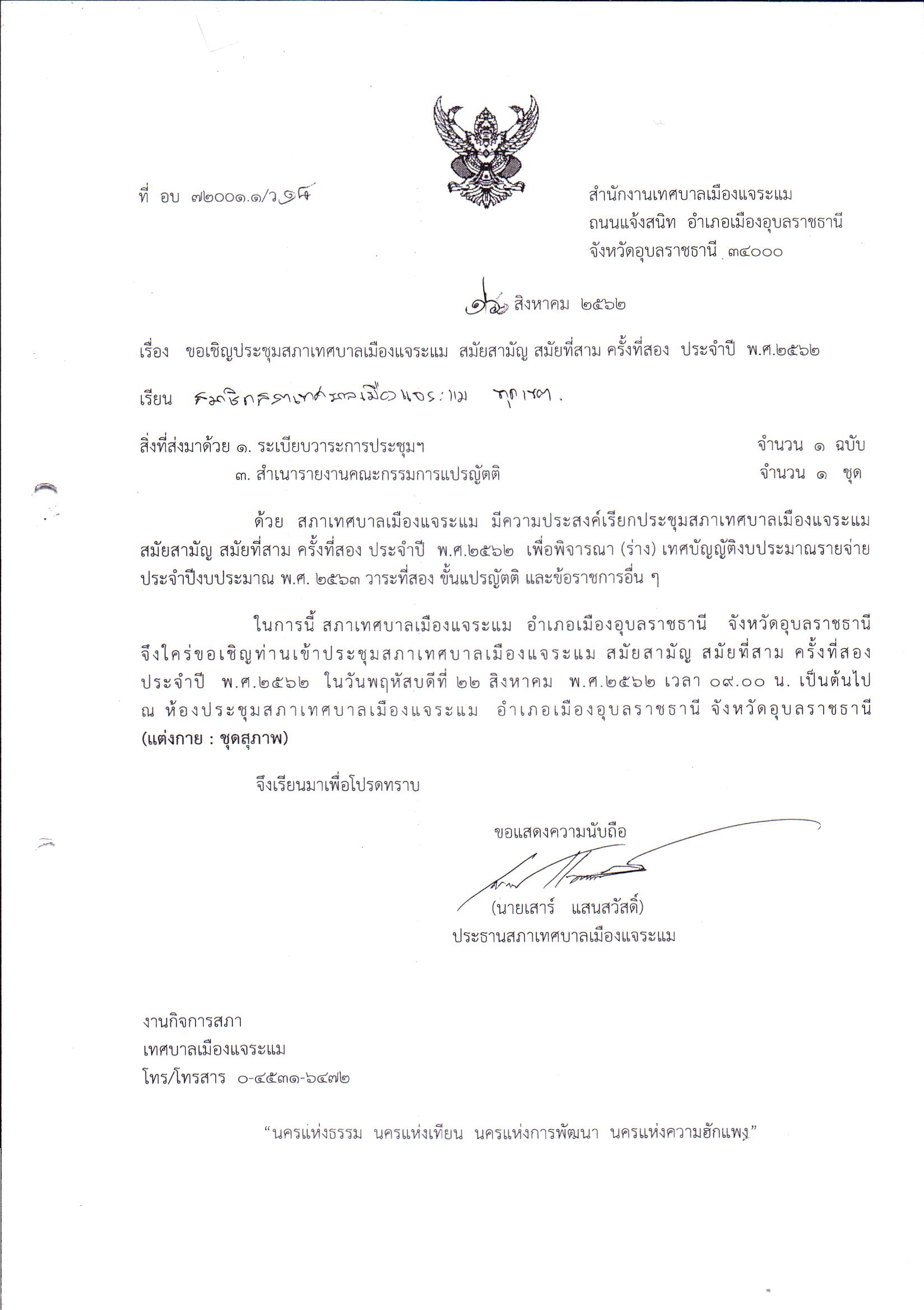เชิญประชุมสภาเทศบาลเมืองแจระแมสมัยสามัญ สมัยที่สาม ครั้งที่ 2 ประจำปี พ.ศ.2563