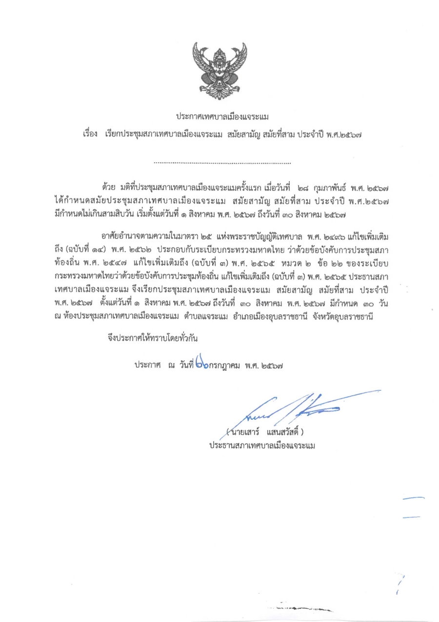 ประกาศเทศบาลเมืองแจระแม เรื่อง เรียกประชุมสภาเทศบาลเมืองแจระแม สมัยสามัญ สมัยที่สาม ครั้งที่ 1 ประจำปี พ.ศ. 2567