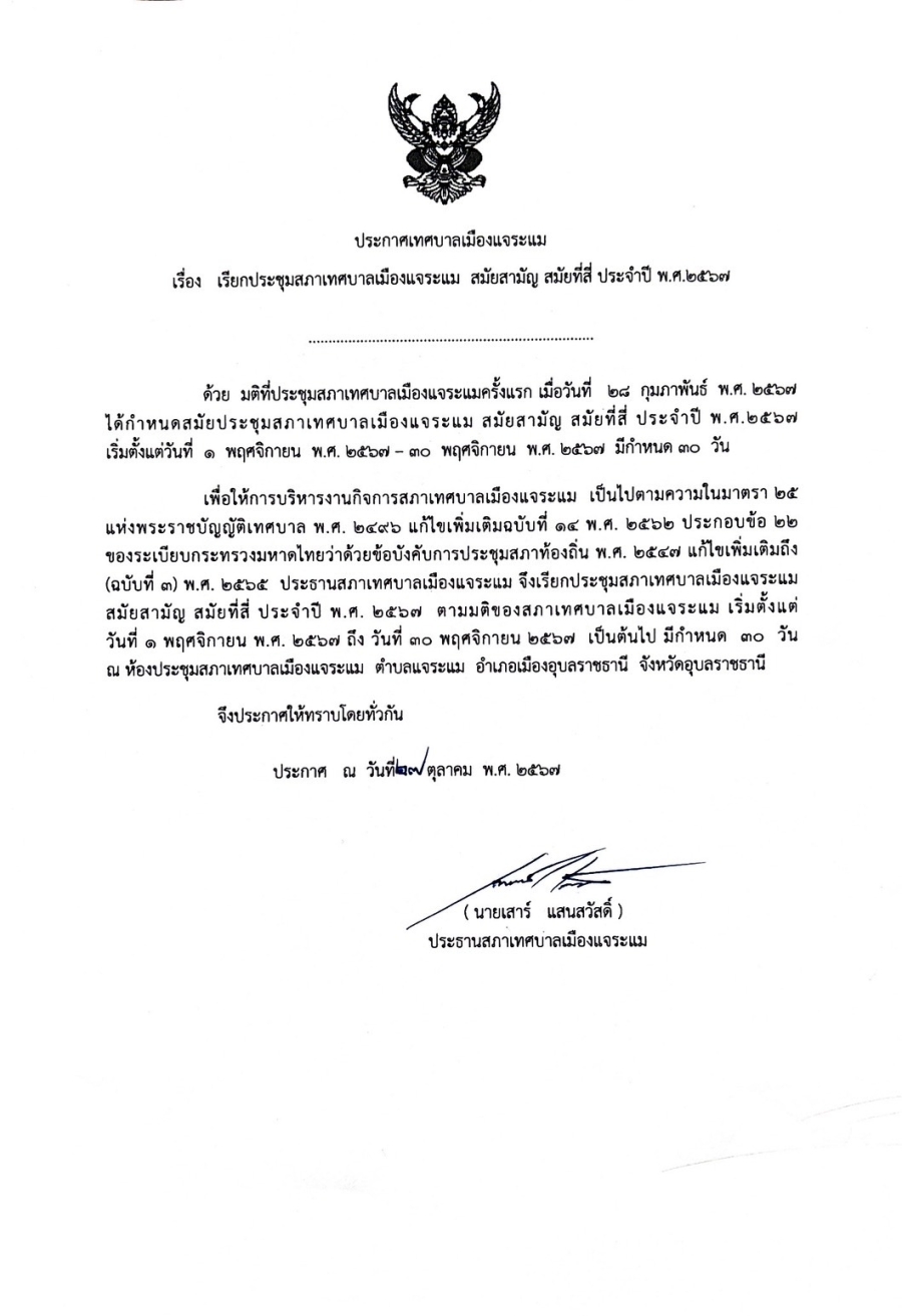 ประกาศเทศบาลเมืองแจระแม เรื่อง เรียกประชุมสภาเทศบาลเมืองแจระแม สมัยสามัญ สมัยที่สี่ ประจำปี พ.ศ. 2567