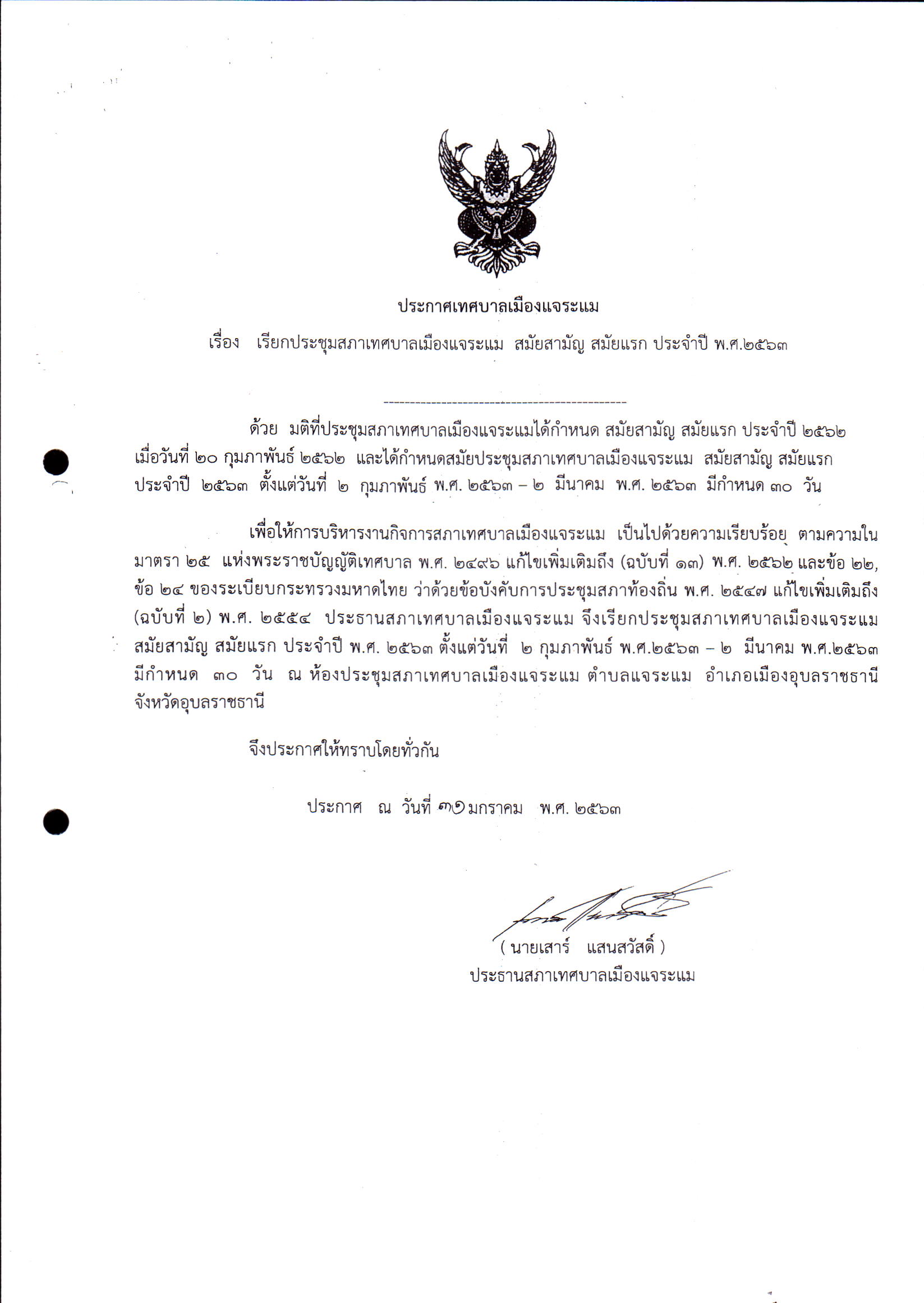 ประกาศเทศบาลเมืองแจระแม เรื่องเรียกประชุมสภาเทศบาลเมืองแจระแมสมัยสามัญ สมัยแรก ประจำปี พ.ศ.2563
