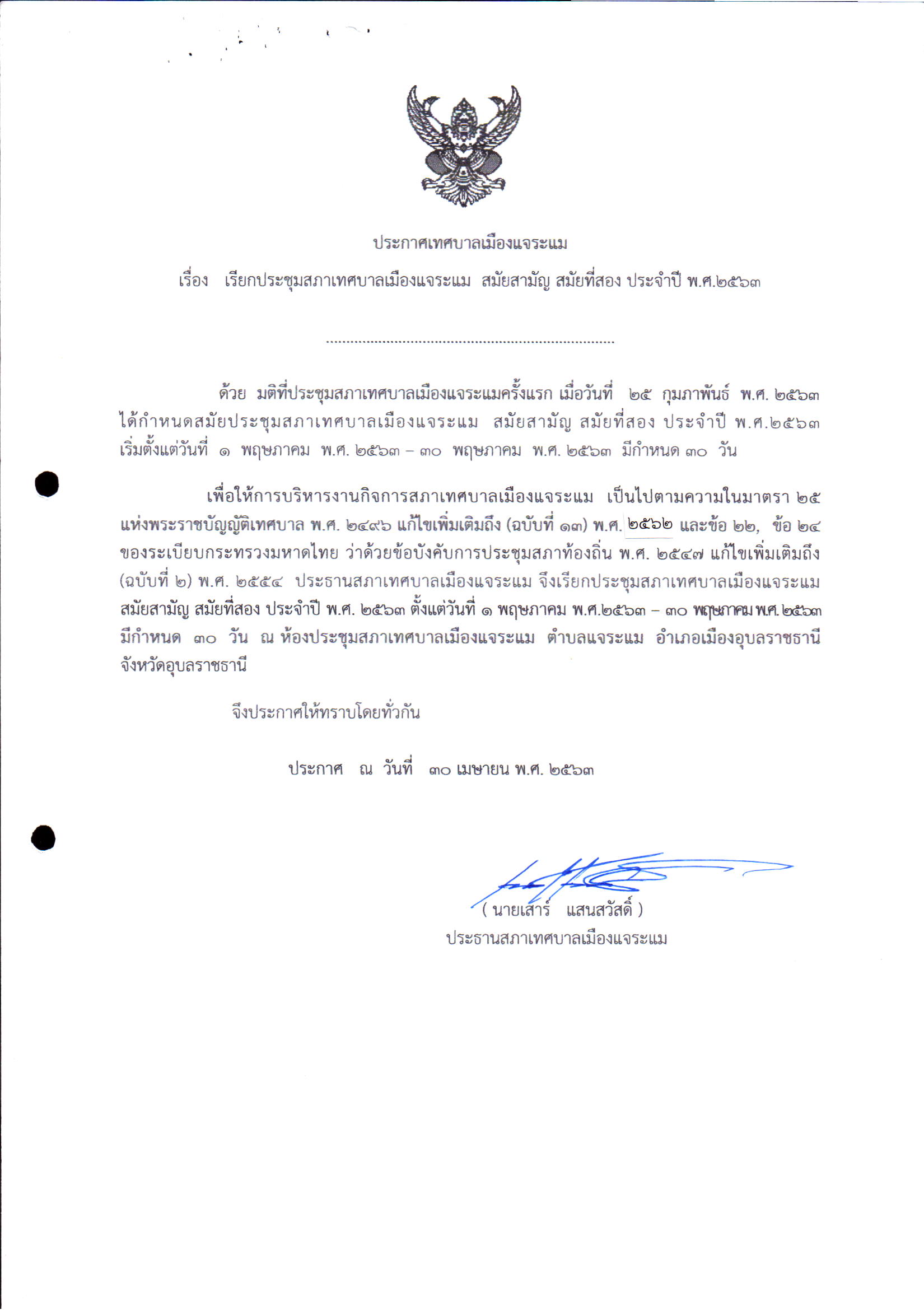 ประกาศเทศบาลเมืองแจระแม เรื่องเรียกประชุมสภาเทศบาลเมืองแจระแมสมัยสามัญ สมัยที่สอง ประจำปี พ.ศ.2563