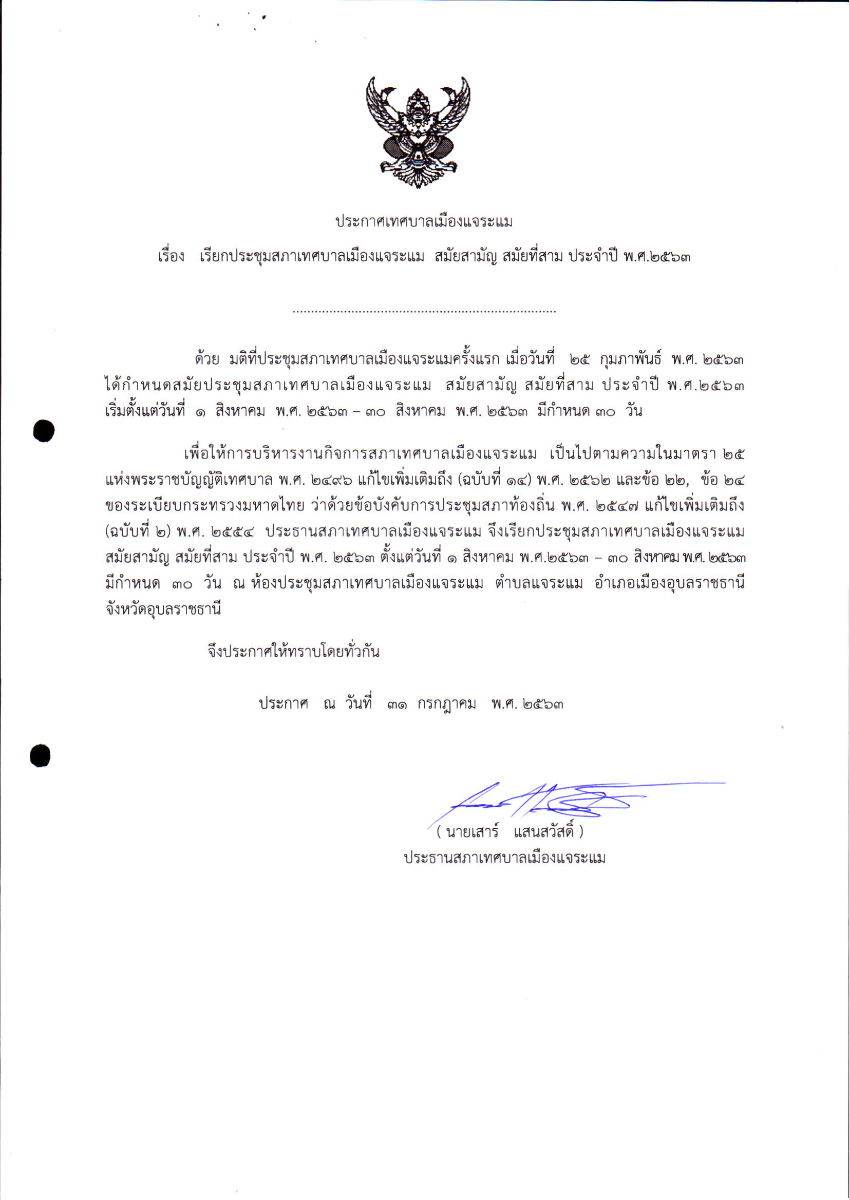 ประกาศเทศบาลเมืองแจระแม เรื่องเรียกประชุมสภาเทศบาลเมืองแจระแมสมัยสามัญ สมัยที่สาม ประจำปี พ.ศ.2563