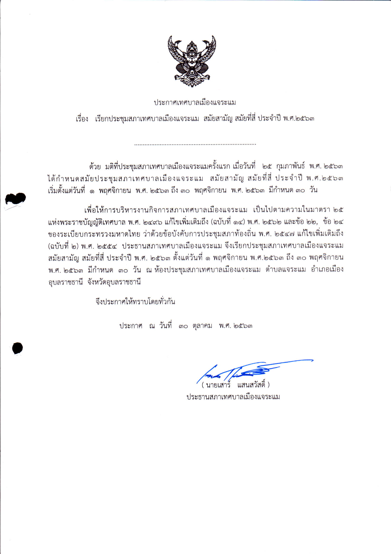 ประกาศเทศบาลเมืองแจระแม เรื่องเรียกประชุมสภาเทศบาลเมืองแจระแมสมัยสามัญ สมัยที่สี่ ประจำปี พ.ศ.2563