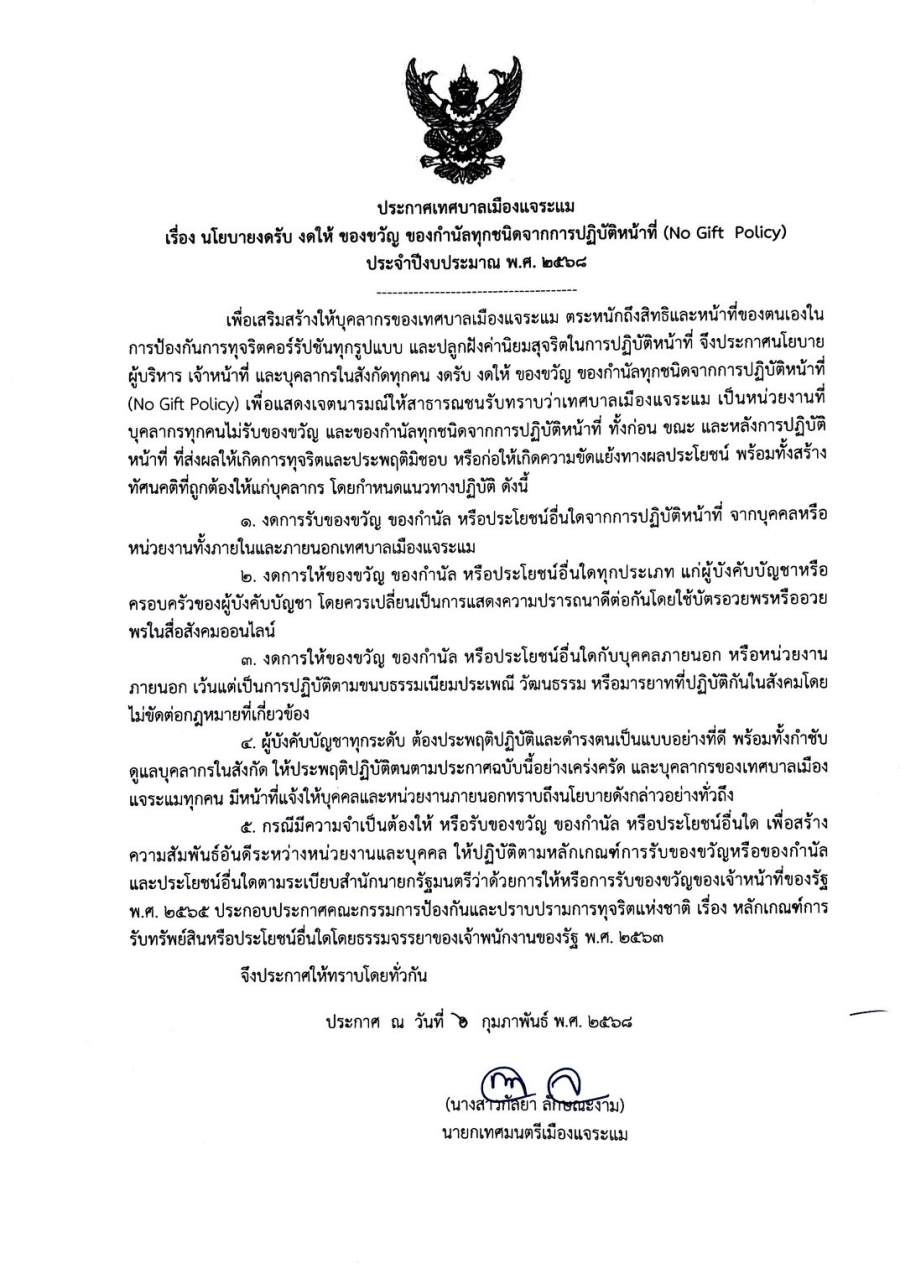ประกาศเทศบาลเมืองแจระแม เรื่อง นโยบายงดรับ งดให้ ของขวัญ ของกำนัลทุกชนิดจากการปฏิบัติหน้าที่ (No Gift Policy) ประจำปีงบประมาณ พ.ศ. 2568 วันพฤหัสบดี, 06 กุมภาพันธ์ 2568 15:17 Print Email back to top