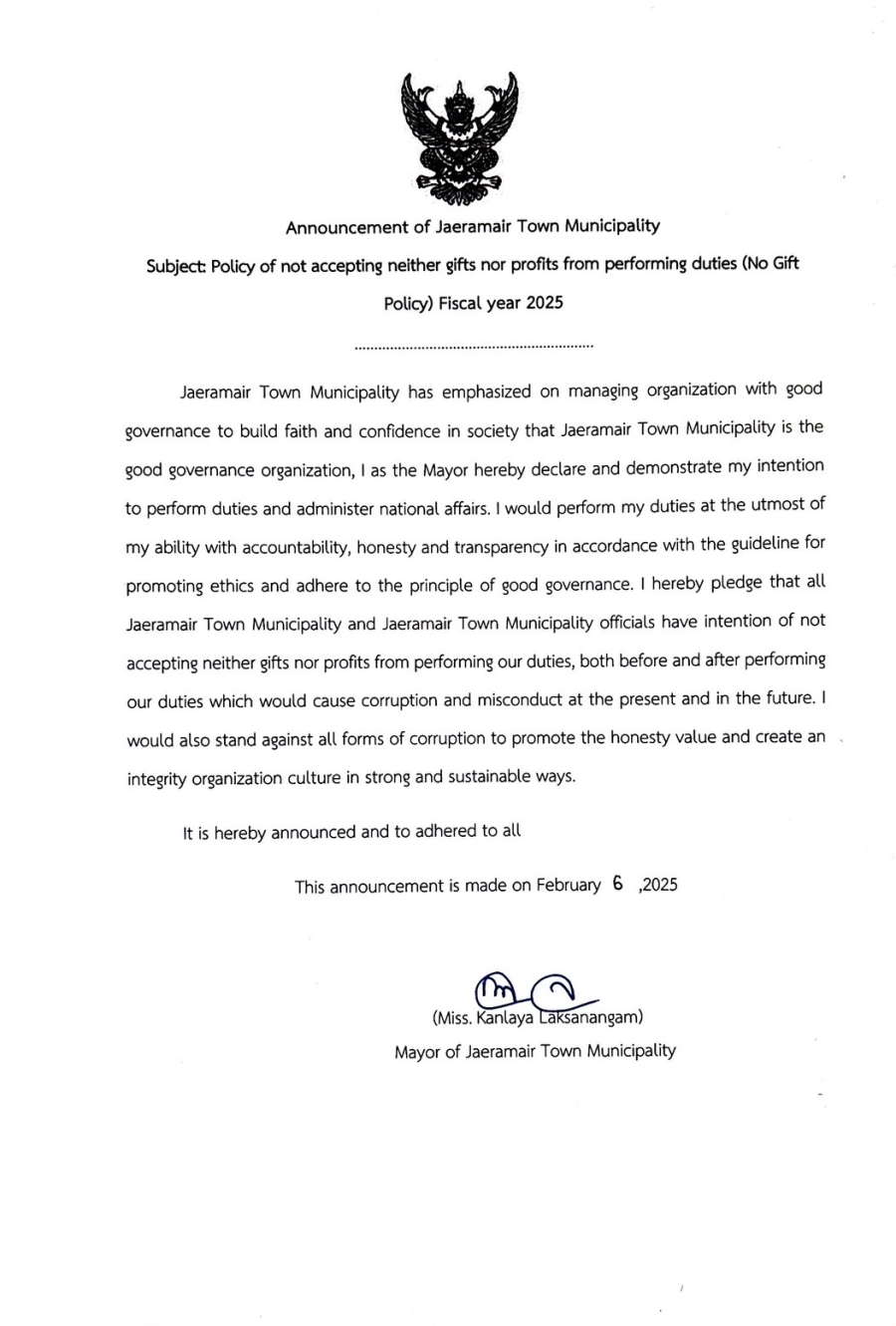 Announcement of Jaeramair Town Municipality Subject: Policy of not accepting neither gifts nor profits from performing duties (No Gift Policy) Fiscal year 2025 วันพฤหัสบดี, 06 กุมภาพันธ์ 2568 15:19 Print Email back to top