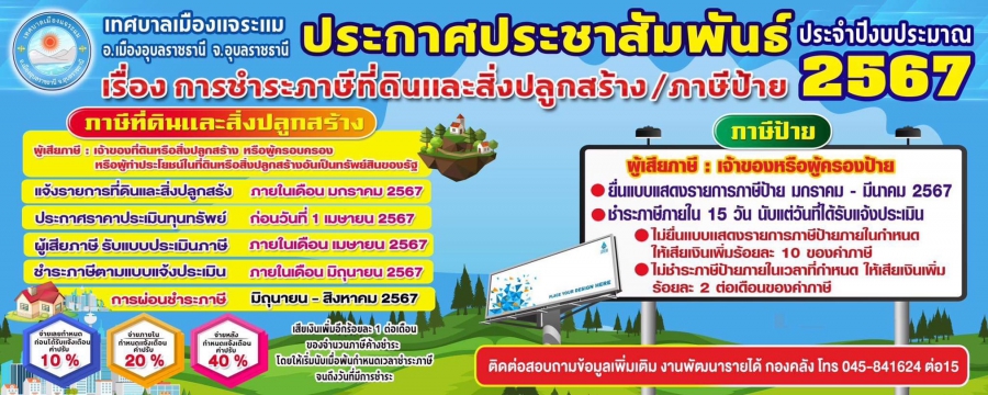 ประชาสัมพันธ์ เรื่อง การชำระภาษีที่ดินและสิ่งปลูกสร้าง/ภาษีป้าย ประจำปีงบประมาณ 2567
