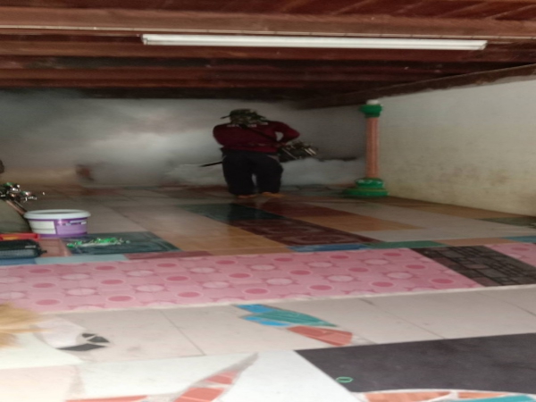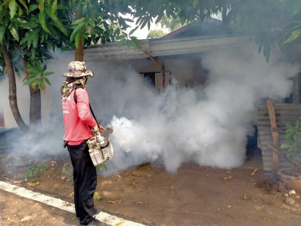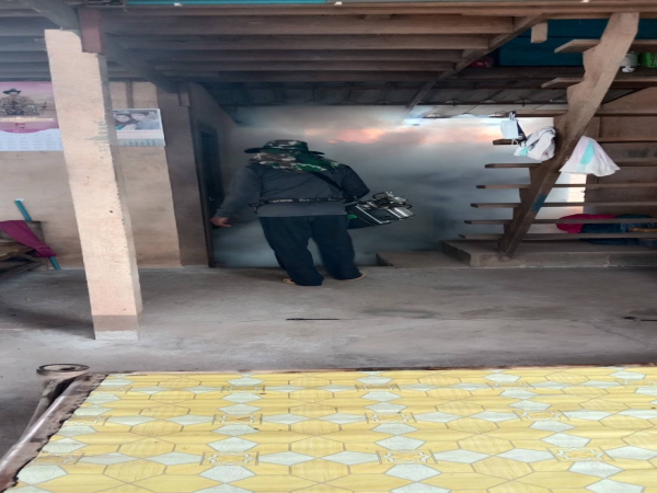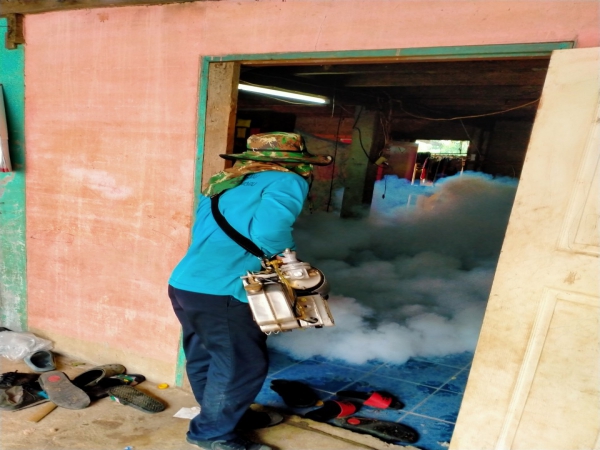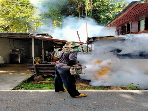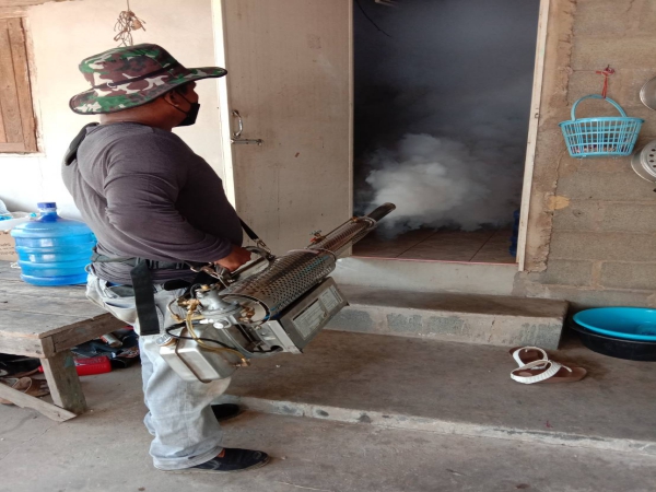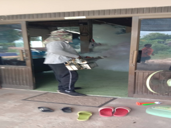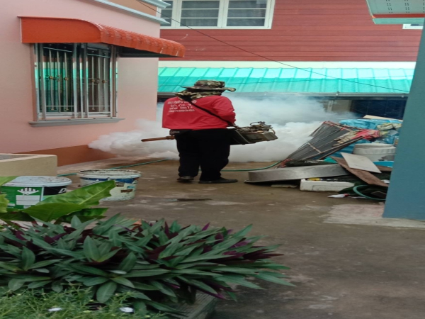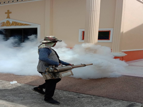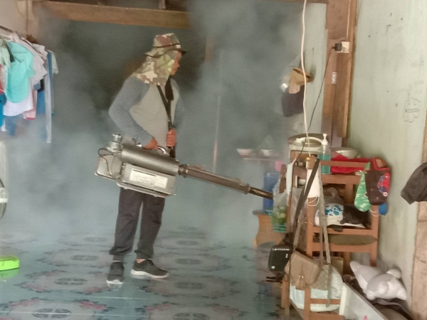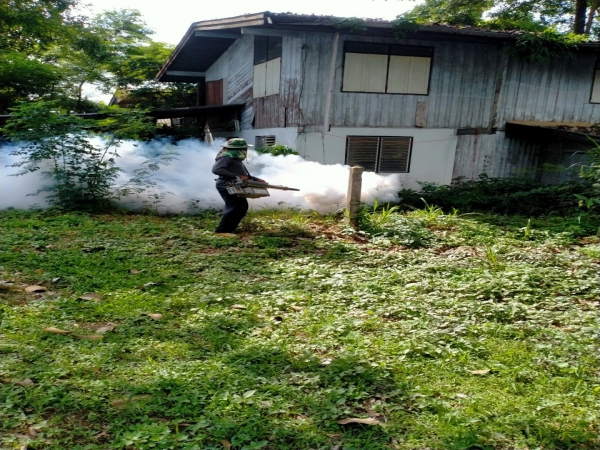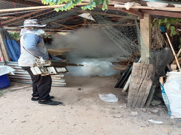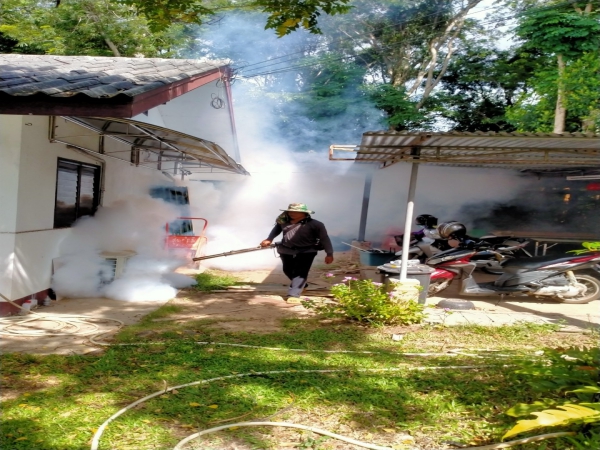 เจ้าหน้าที่กองสาธารณสุขและสิ่งแวดล้อม เทศบาลเมืองแจระแม ฉีดพ่นหมอกควันกำจัดยุงลายเพื่อป้องกันโรคไข้เลือดออกในพื้นที่รับผิดชอบของเทศบาลเมืองแจระแม
