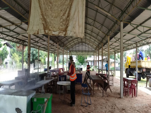 กองสาธารณสุขและสิ่งแวดล้อม เทศบาลเมืองแจระแม ออกฉีดพ่นยาฆ่าเชื้อเพื่อป้องกันการแพร่ระบาดของโรคติดเชื้อไวรัสโคโรนา 2019 (COVID-19) ในพื้นที่ตำบลแจระแม
