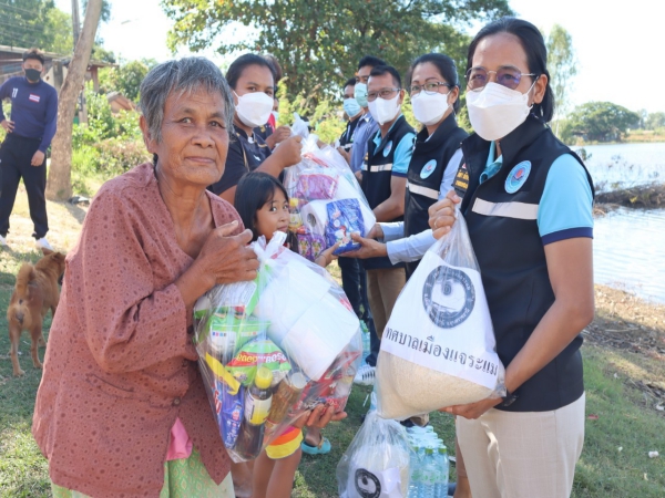 นายกเทศมนตรีเมืองแจระแม พร้อมคณะผู้บริหารและเจ้าหน้าที่เทศบาลเมืองแจ ร่วมส่งมอบถุงยังชีพให้แก่ผู้ประสพอุทกภัย ในพื้นที่ หมู่ที่ 6 บ้านคูเดื่อ และหมู่ที่ 8 บ้านท่ากกแห่