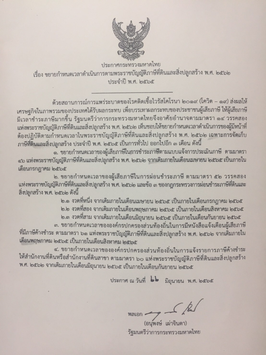 ประกาศกระทรวงมหาดไทยขยายกำหนดเวลาดำเนินการตามพระราชบัญญัติภาษีที่ดินและสิ่งปลูกสร้าง พ.ศ.2562 ประจำปี 2565