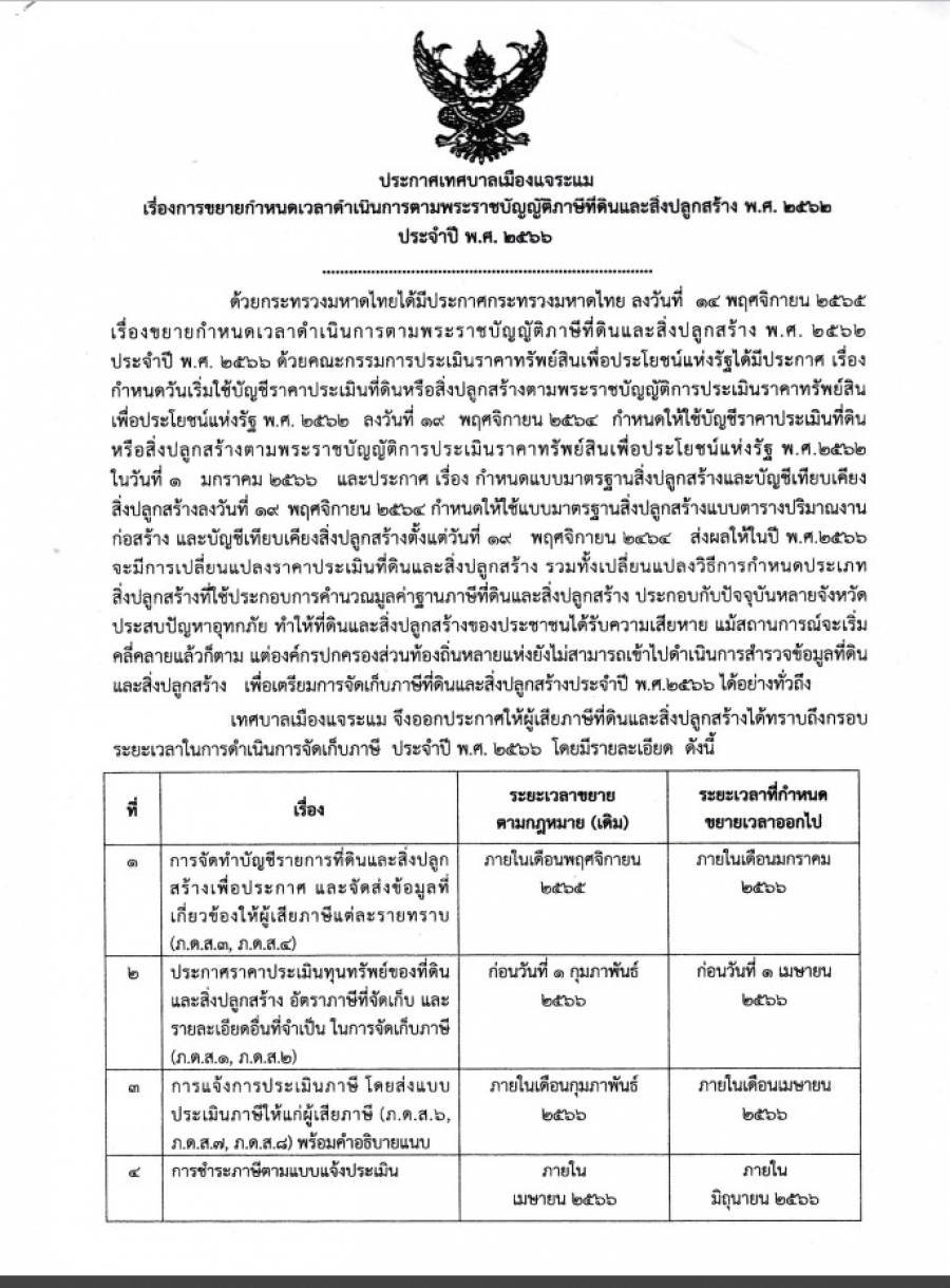 ประกาศเทศบาลเมืองแจระแม เรื่อง การขยายกำหนดเวลาดำเนินการตามพระราชบัญญัติภาษีที่ดินและสิ่งปลูกสร้าง พ.ศ.2562 ประจำปี พ.ศ.2566