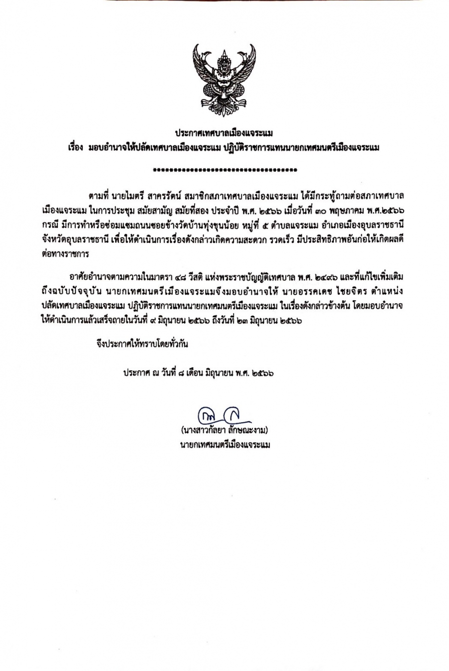 ประกาศเทศบาลเมืองแจระแม เรื่อง มอบอำนาจให้ปลัดเทศบาลเมืองแจระแม ปฏิบัติราชการแทนนายกเทศมนตรีเมืองแจระแม รายละเอียดตามเอกสารแนบ