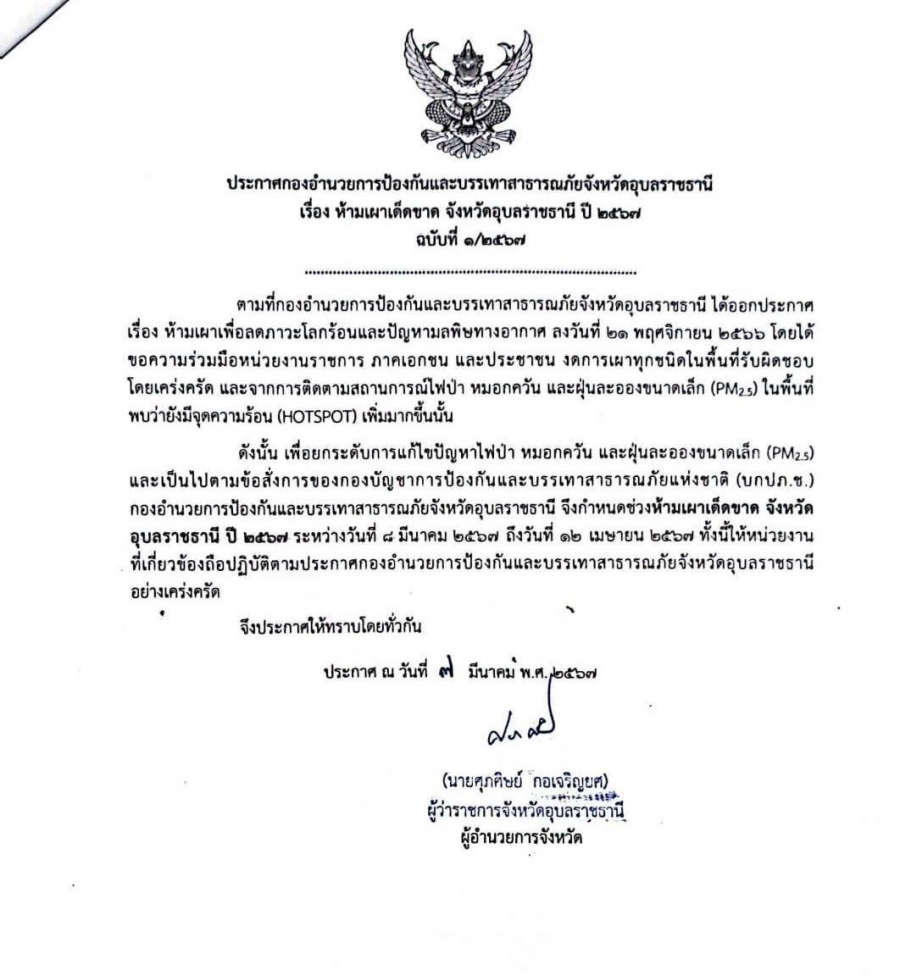 ประกาศ กองอำนวยการป้องกันและบรรเทาสาธารณภัยจังหวัดอุบลราชธานี เรื่องห้ามเผาเด็ดขาด จังหวัดอุบลราชธานี ปี 2567 ฉบับที่ 1/2567