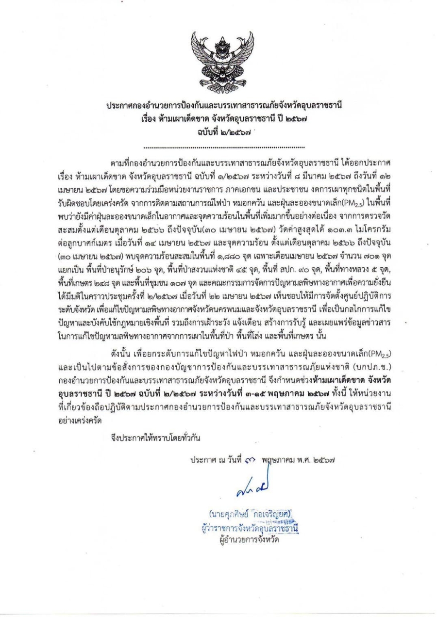 ประกาศ กองอำนวยการป้องกันและบรรเทาสาธารณภัยจังหวัดอุบลราชธานี เรื่องห้ามเผาเด็ดขาด จังหวัดอุบลราชธานี ปี 2567 ฉบับที่ 2/2567
