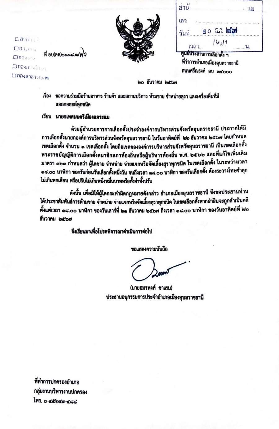 ห้ามขาย จำหน่าย จ่ายแจก หรือจัดเลี้ยงสุราทุกชนิด ในเขตเลือกตั้ง หากฝ่าฝืนจะถูกดำเนินคดี ตั้งแต่เวลา 18:00 น. ของวันเสาร์ที่ 21 ธันวาคม 2567 ถึงเวลา 18:00 น. ของวันอาทิตย์ที่ 22 ธันวาคม 2567
