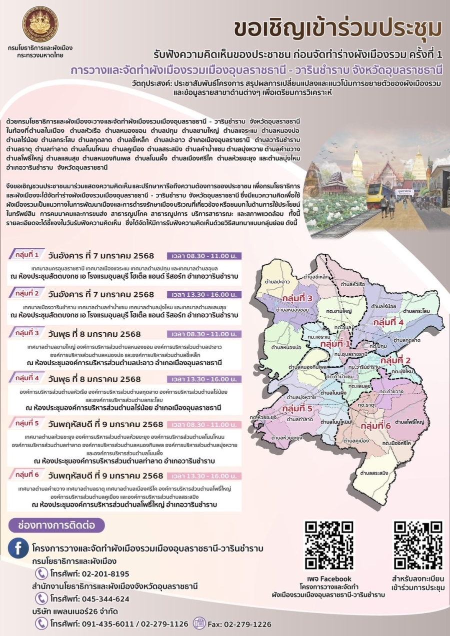 ขอเชิญเข้าร่วมประชุมรับฟังความคิดเห็นของประชาชนก่อนจัดทำร่างผังเมืองรวม ครั้งที่ 1 โครงการวางและจัดทำผังเมืองรวมเมืองอุบลราชธานี-วารินชำราบ จังหวัดอุบลราชธานี