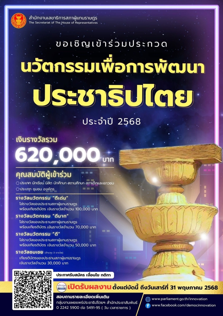 ประชาสัมพันธ์ ขอเชิญชวนส่งผลงานเข้าร่วม "ประกวดนวัตกรรมเพื่อการพัฒนาประชาธิปไตย ประจำปี 2568"