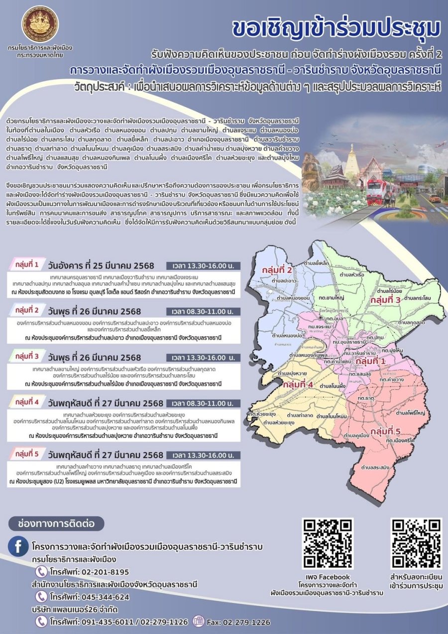 ขอเชิญเข้าร่วมประชุมรับฟังความคิดเห็นของประชาชนก่อนจัดทำร่างผังเมืองรวม ครั้งที่ 2 โครงการวางและจัดทำผังเมืองรวมเมืองอุบลราชธานี-วารินชำราบ จังหวัดอุบลราชธานี