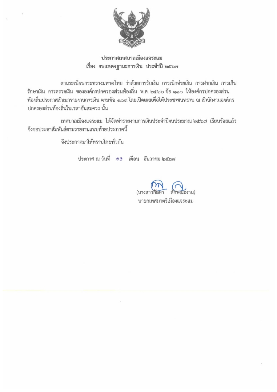งบแสดงฐานะการเงิน ประจำปี 2567 วันอังคาร, 17 ธันวาคม 2567 15:51 font size decrease font size increase font size Print Email ประกาศเทศบาลเมืองแจระแม เรื่อง งบแสดงฐานะการเงิน ประจำปี 2567 ดาวน์โหลดเอกสาร year2024.pdf (0 Downloads) back to top