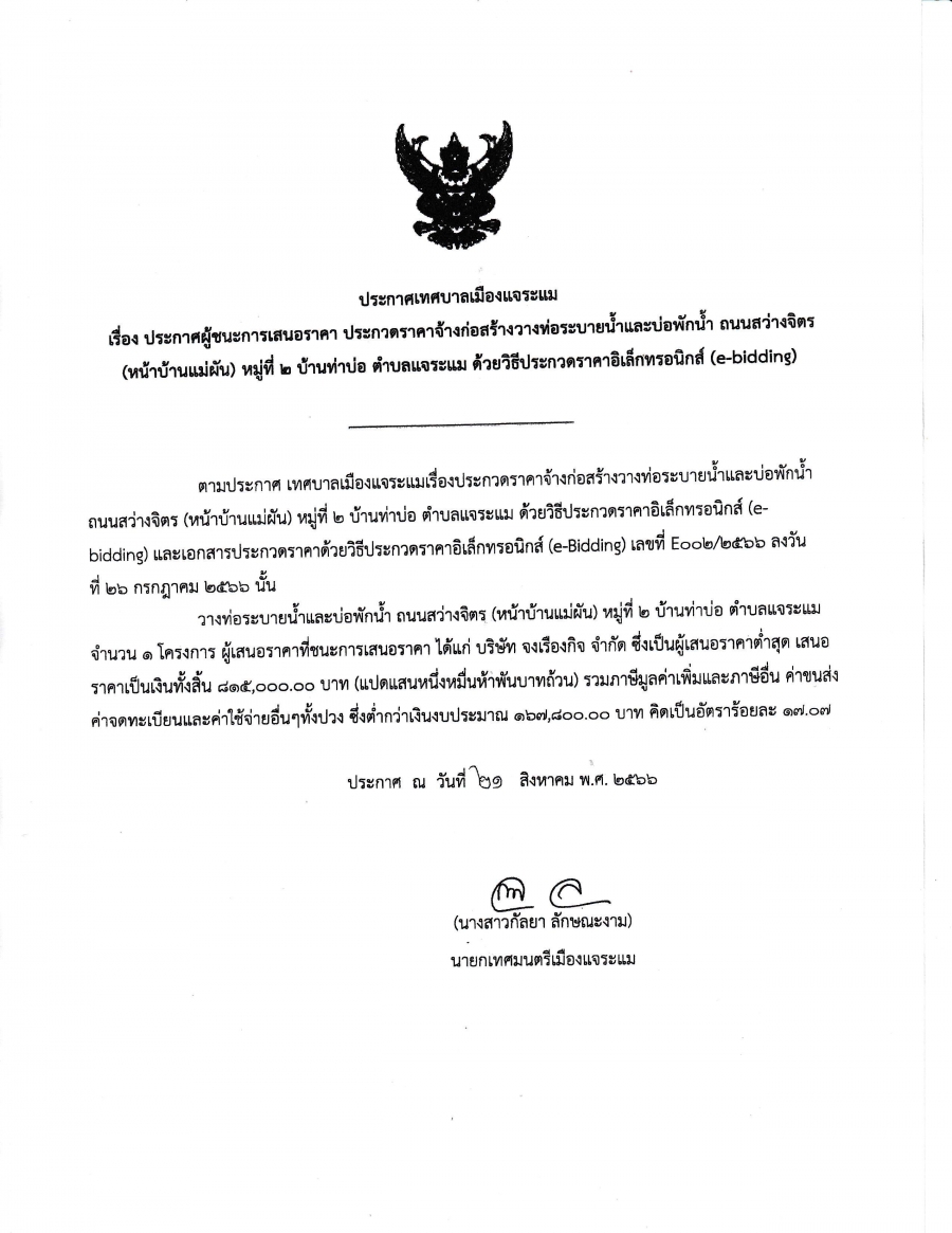 ประกาศผู้ชนะการเสนอราคา ประกวดราคาจ้างก่อสร้างวางท่อระบายน้ำและบ่อพักน้ำ ถนนสว่างจิตร(หน้าบ้านแม่ผัน) หมู่ที่ 2 บ้านท่าบ่อ ตำบลแจระแม ด้วยวิธีประกวดราคาอิเล็กทรอนิกส์ (e-bidding)
