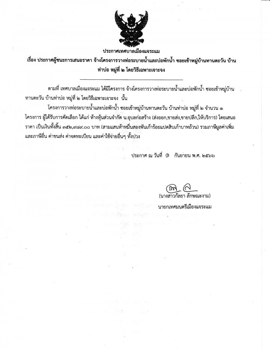 เรื่อง ประกาศผู้ชนะการเสนอราคา จ้างโครงการวางท่อระบายน้ำและบ่อพักน้ำ ซอยเข้าหมู่บ้านทานตะวัน บ้านท่าบ่อ หมู่ที่ 2 โดยวิธีเฉพาะเจาะจง