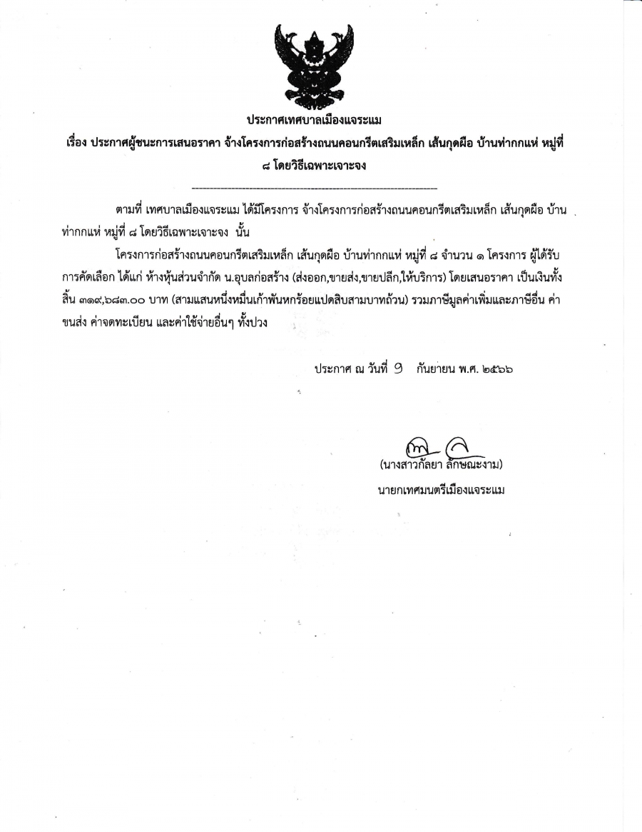 เรื่อง ประกาศผู้ชนะการเสนอราคา จ้างโครงการก่อสร้างถนนคอนกรีตเสริมเหล็ก เส้นกุดผือ บ้านท่ากกแห่ หมู่ที่ 8 โดยวิธีเฉพาะเจาะจง