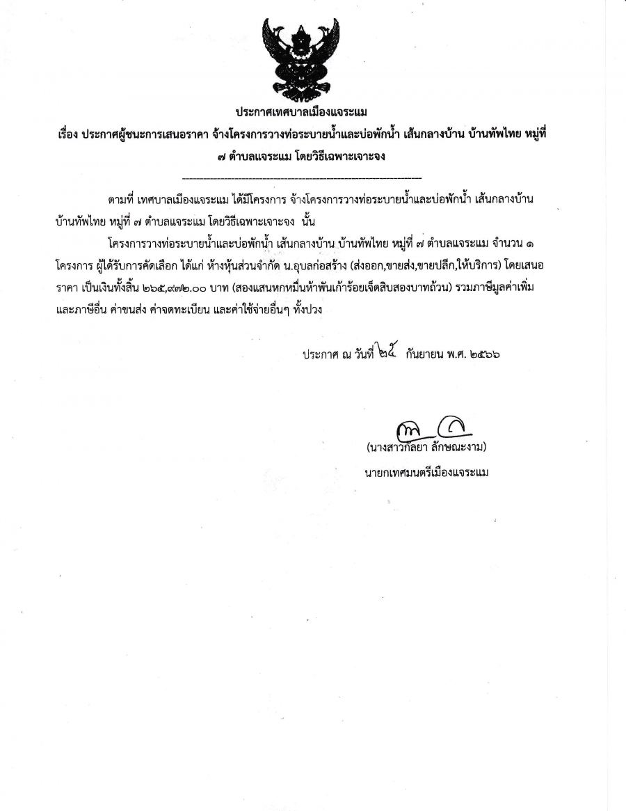 ประกาศผู้ชนะการเสนอราคา จ้างโครงการวางท่อระบายน้ำและบ่อพักน้ำ เส้นกลางบ้าน บ้านทัพไทย หมู่ที่ 7 ตำบลแจระแม โดยวิธีเฉพาะเจาะจง