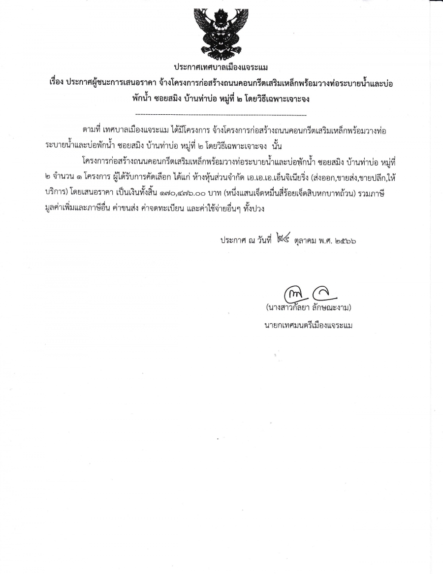 ประกาศผู้ชนะการเสนอราคา จ้างโครงการก่อสร้างถนนคอนกรีตเสริมเหล็กพร้อมวางท่อระบายน้ำและบ่อพักน้ำ ซอยสมิง บ้านท่าบ่อ หมู่ที่ 2 โดยวิธีเฉพาะเจาะจง