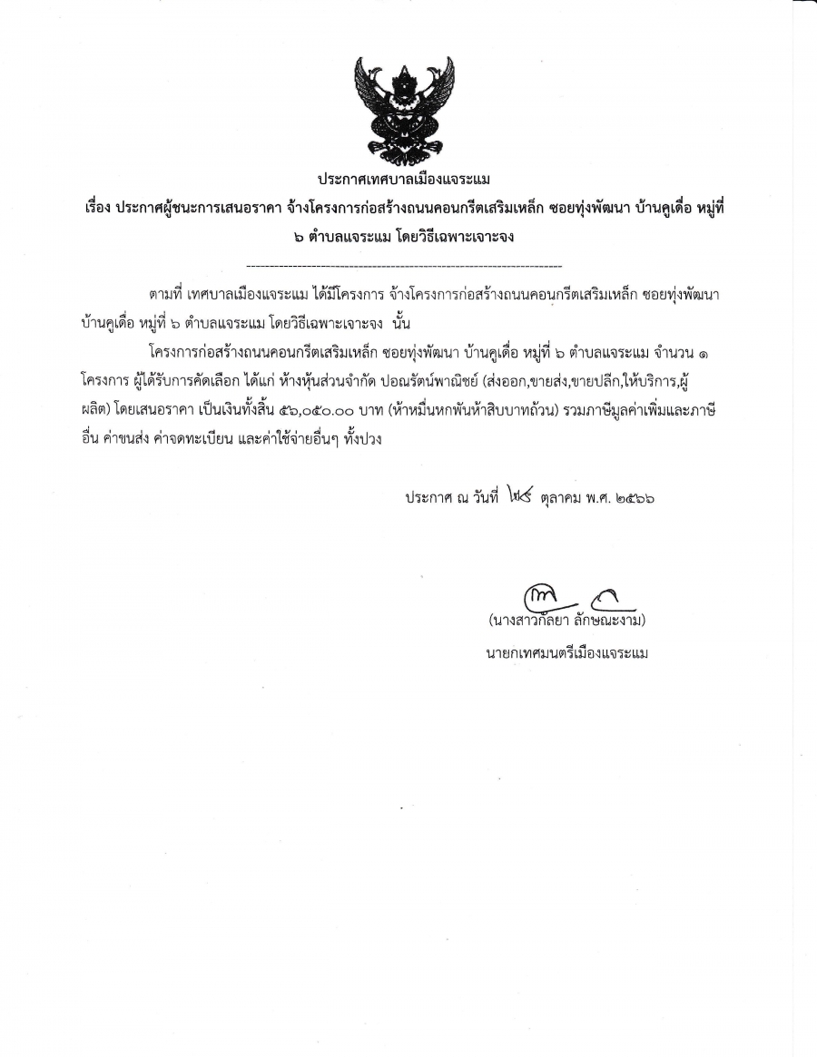 เรื่อง ประกาศผู้ชนะการเสนอราคา จ้างโครงการก่อสร้างถนนคอนกรีตเสริมเหล็ก ซอยทุ่งพัฒนา บ้านคูเดื่อ หมู่ที่ 6 ตำบลแจระแม โดยวิธีเฉพาะเจาะจง