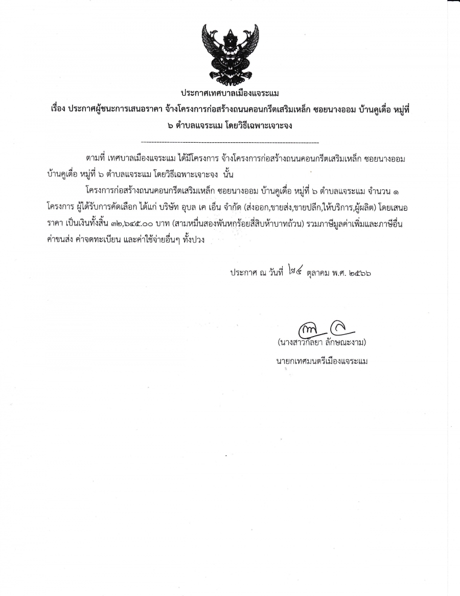 เรื่อง ประกาศผู้ชนะการเสนอราคา จ้างโครงการก่อสร้างถนนคอนกรีตเสริมเหล็ก ซอยนางออม บ้านคูเดื่อ หมู่ที่ 6 ตำบลแจระแม โดยวิธีเฉพาะเจาะจง