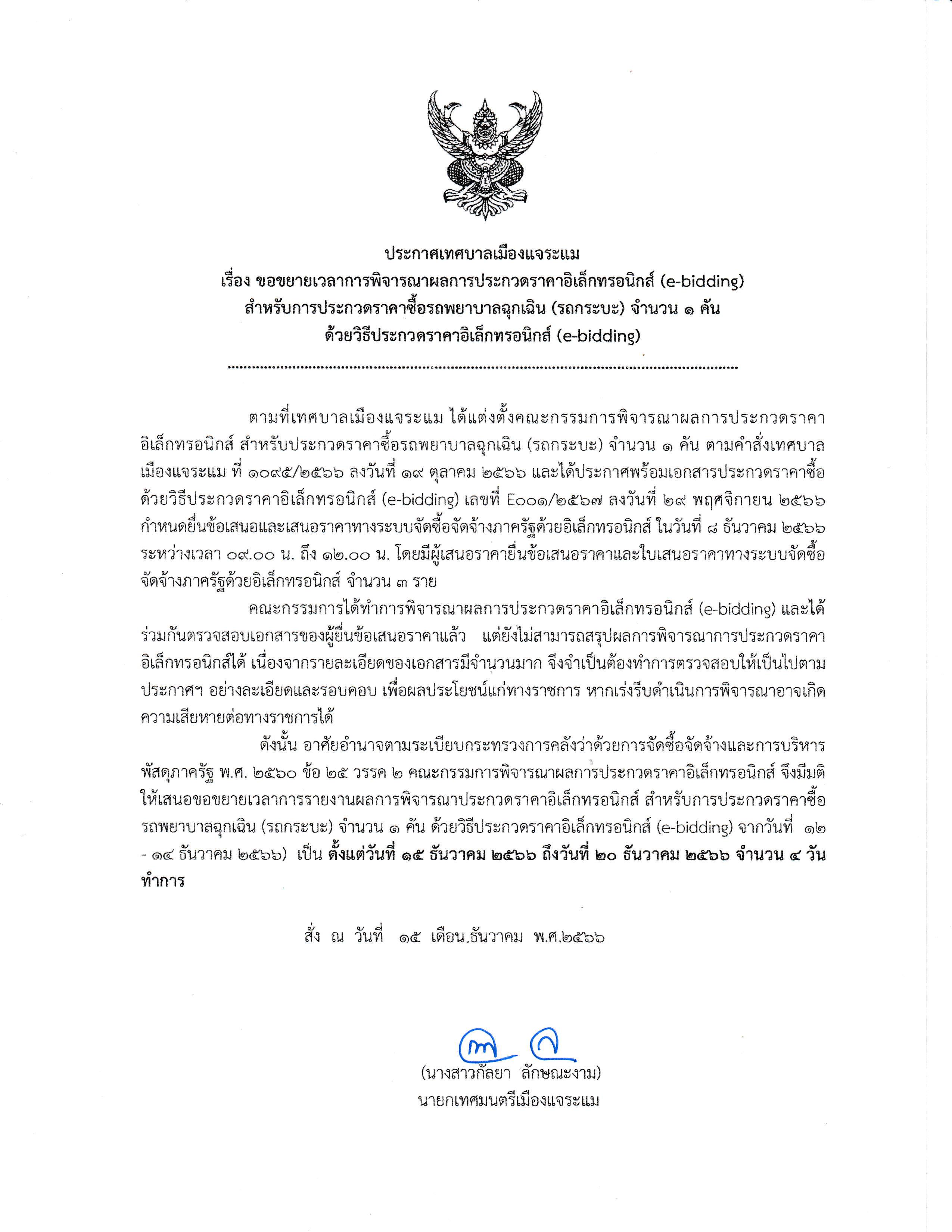 ขอขยายเวลาการพิจารณาผลการประกวดราคาอิเล็กทรอนิกส์ (e-bidding) สำหรับการประกวดราคาซื้อรถพยาบาลฉุกเฉิน (รถกระบะ) จำนวน 1 คัน ด้วยวิธีประกวดราคาอิเล็กทรอนิกส์ (e-bidding)
