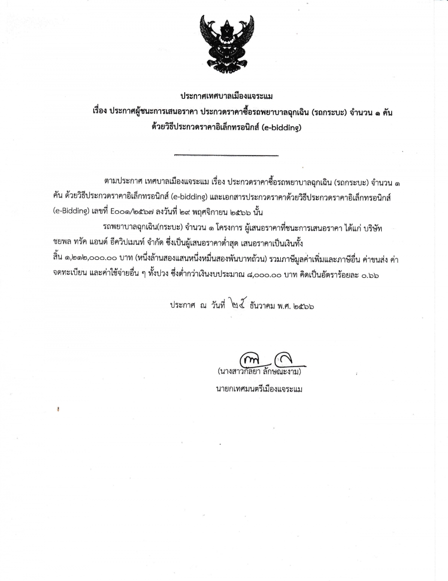 ประกาศผู้ชนะการเสนอราคา ประกวดราคาซื้อรถพยาบาลฉุกเฉิน (รถกระบะ) จำนวน 1 คัน ด้วยวิธีประกวดราคาอิเล็กทรอนิกส์(e-bidding)