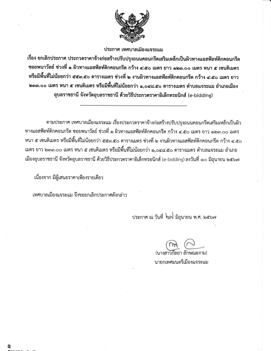 ยกเลิกประกาศ ประกวดราคาจ้างก่อสร้างปรับปรุงถนนคอนกรีต เสริมเหล็กเป็นผิวทางแอสฟัลต์ติกคอนกรีต ซอยพนาวัลย์ บ้านท่าบ่อ หมู่ที่ 2 ด้วยวิธีประกวดราคาอิเล็กทรอนิกส์(e-bidding)