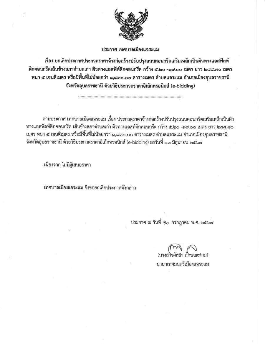 ยกเลิกประกาศ ประกวดราคาจ้างก่อสร้างปรับปรุงถนนคอนกรีตเสริมเหล็กเป็นผิวทางแอสฟัลท์ติกคอนกรีต เส้นข้างสภาตำบลเก่า บ้านท่าบ่อ หมู่ที่ 1 ด้วยวิธีประกวดราคาอิเล็กทรอนิกส์ (e-bidding)