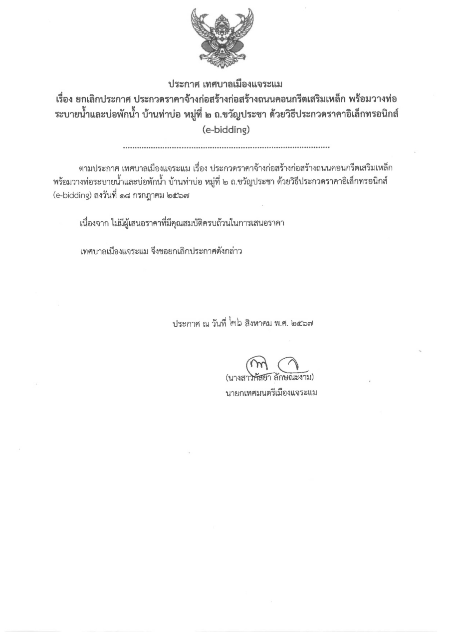 ยกเลิกประกาศ ประกวดราคาจ้างก่อสร้างถนนคอนกรีตเสริมเหล็ก พร้อมวางท่อระบายน้ำและบ่อพักน้ำ บ้านท่าบ่อ หมู่ที่ 2 ถนนขวัญประชาด้วยวิธีประกวดราคาอิเล็กทรอนิกส์ (e-bidding)