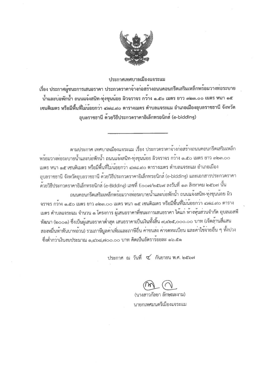 ประกาศผู้ชนะการเสนอราคา ประกวดราคาจ้างก่อสร้างถนนคอนกรีตเสริมเหล็ก พร้อมวางท่อระบายน้ำและบ่อพักน้ำ ถนนแจ้งสนิท-ทุ่งขุนน้อย ด้วยวิธีประกวดราคาอิเล็กทรอนิกส์ (e-bidding)