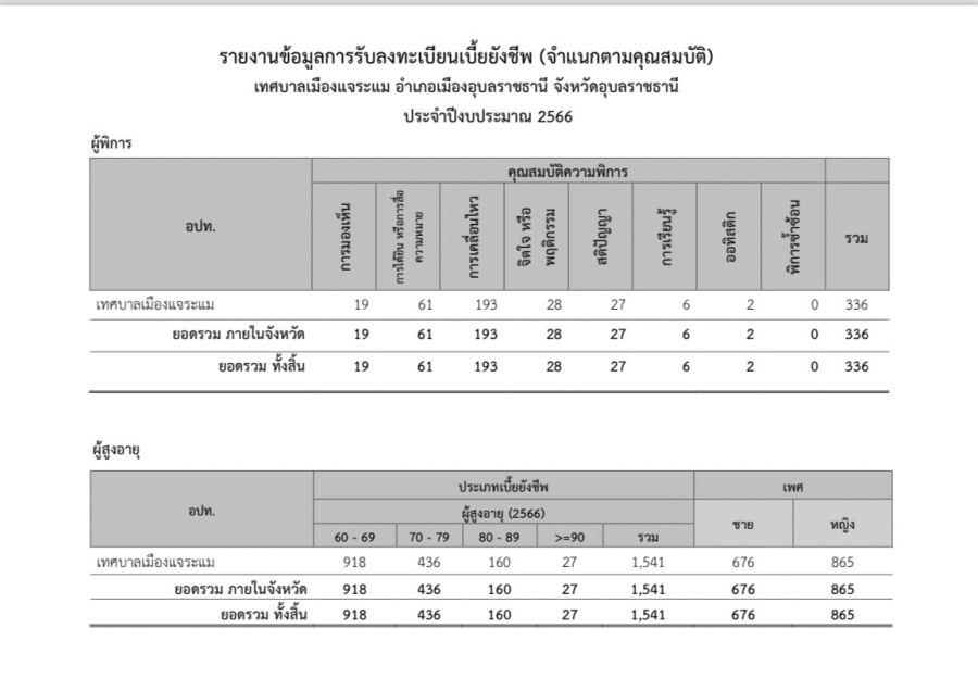 รายงานข้อมูลการรับลงทะเบียนเบี้ยยังชีพ (จำแนกตามคุณสมบัติ) ประจำปีงบประมาณ พ.ศ. 2566