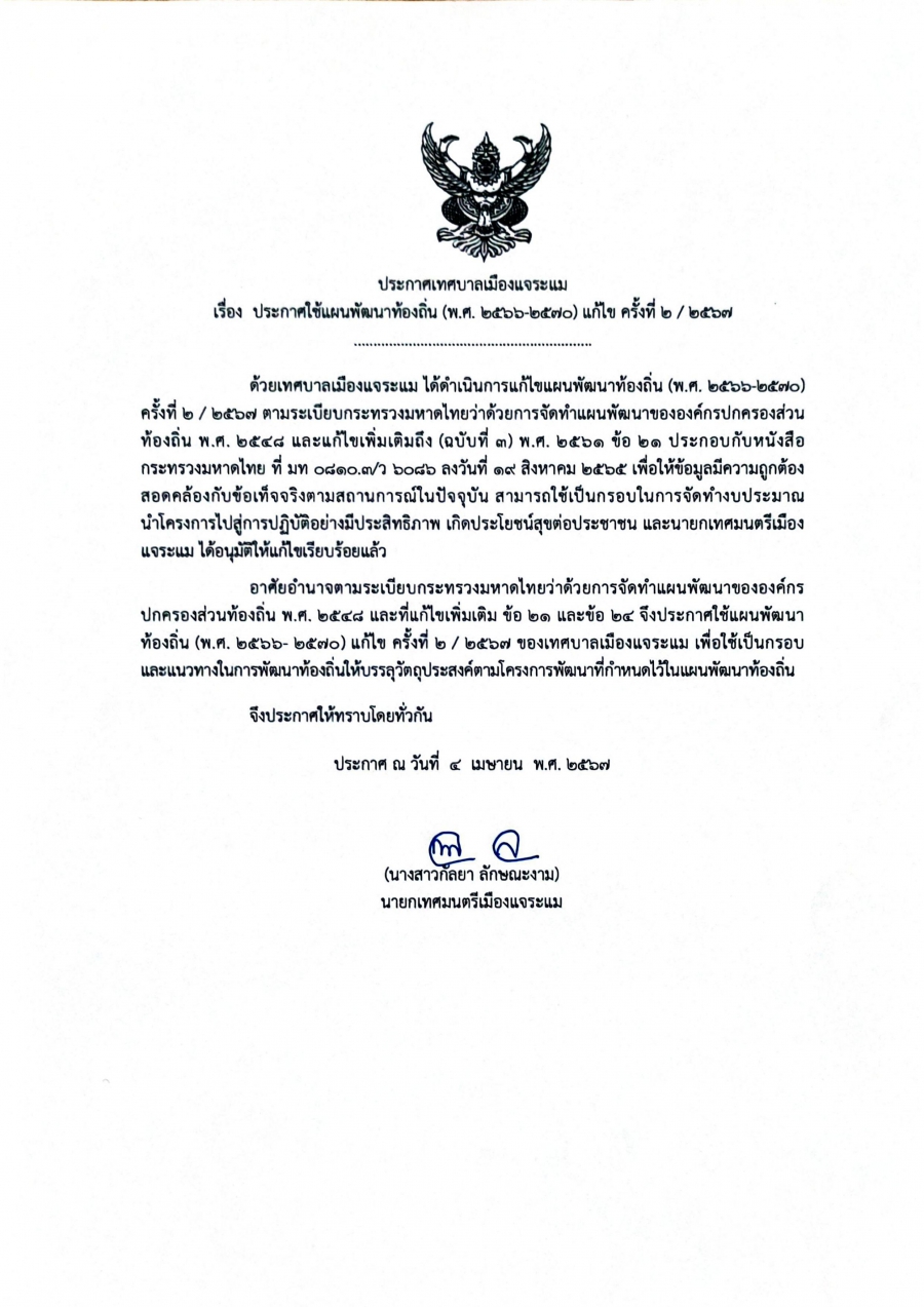 แผนพัฒนาท้องถิ่น ( พ.ศ.2566 - พ.ศ.2570 ) แก้ไขครั้งที่ 2/2567 วันศุกร์, 05 เมษายน 2567 18:34 Print Email ประกาศใช้แผนพัฒนาท้องถิ่น (พ.ศ.2566- พ.ศ.2570) แก้ไขครั้งที่ 2/2567 back to top