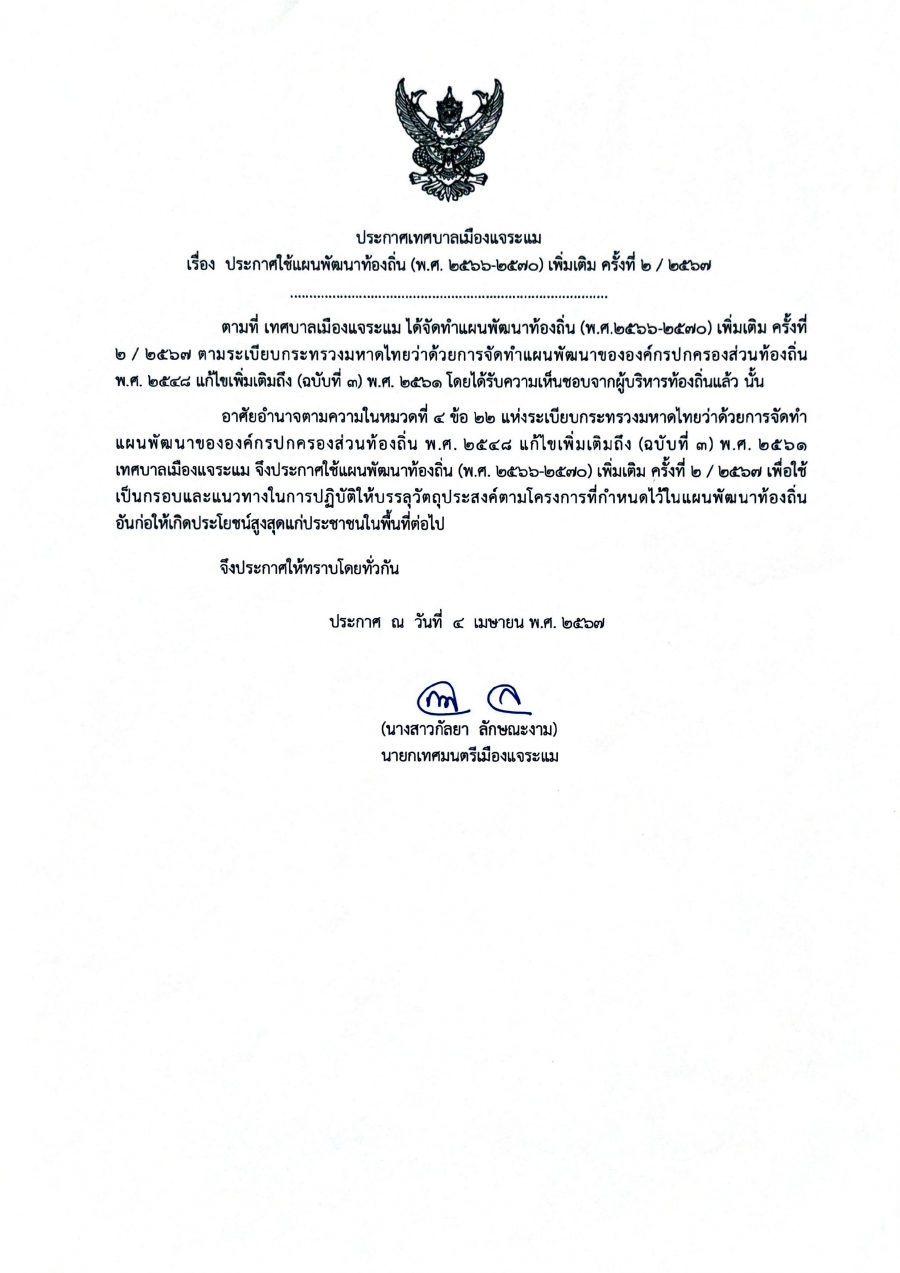 แผนพัฒนาท้องถิ่น ( พ.ศ.2566 - พ.ศ. 2570 ) เพิ่มเติม ครั้งที่ 2/2567 วันศุกร์, 05 เมษายน 2567 18:37 Print Email ประกาศใช้แผนพัฒนาท้องถิ่น (พ.ศ.2566 - พ.ศ.2570) เพิ่มเติม ครั้งที่ 2/2567 back to top
