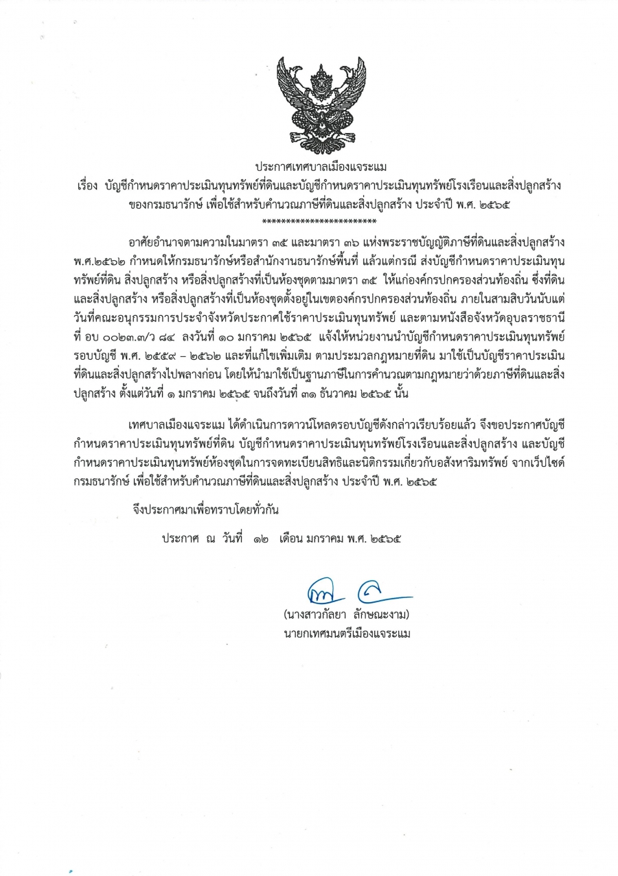 วันศุกร์, 14 มกราคม 2565 00:52ประกาศเทศบาลเมืองแจระแม