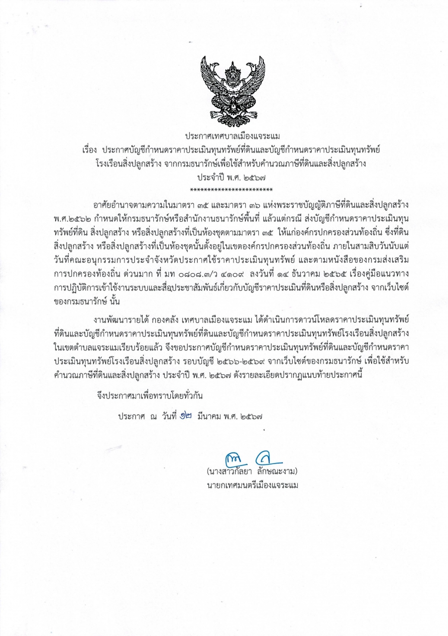 เรื่อง บัญชีกำหนดราคาประเมินทุนทรัพย์ที่ดินและบัญชีกำหนดราคาประเมินทุนทรัพย์โรงเรือนและสิ่งปลูกสร้างของกรมธนารักษ์ เพื่อใช้คำนวณภาษีที่ดินและสิ่งปลูกสร้าง ประจำปี พ.ศ.2567