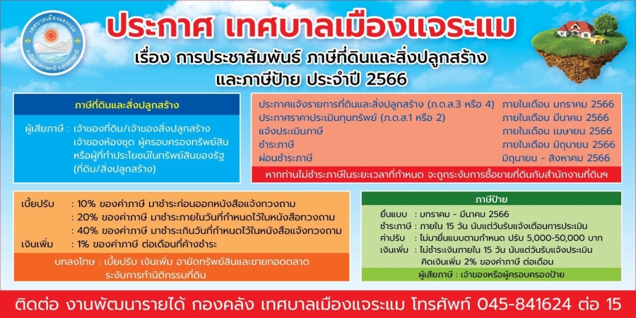 ด้วยถึงกำหนดระยะการยื่นแบบและชำระภาษีท้องถิ่น ประจำปี 2566 เทศบาลเมืองแจระแม จึงขอแจ้งประชาสัมพันธ์กำหนดระยะเวลาการชำระภาษีที่ดินและสิ่งปลูกสร้าง และภาษีป้าย ประจำปี 2566 เพื่อเป็นการประชาสัมพันธ์ให้เจ้าของหรือผู้ครอบครองป้ายได้ยื่นแบบพิมพ์ตามระยะเวลาที่กฎหมายกำหนดและให้ผู้ชำระภาษีที่ดินและสิ่งปลูกสร้างทราบถึงห้วงระยะเวลาการชำระภาษีหากท่านมีข้อสงสัยประการใด โปรดติดต่อสอบถามเจ้าหน้าที่ :