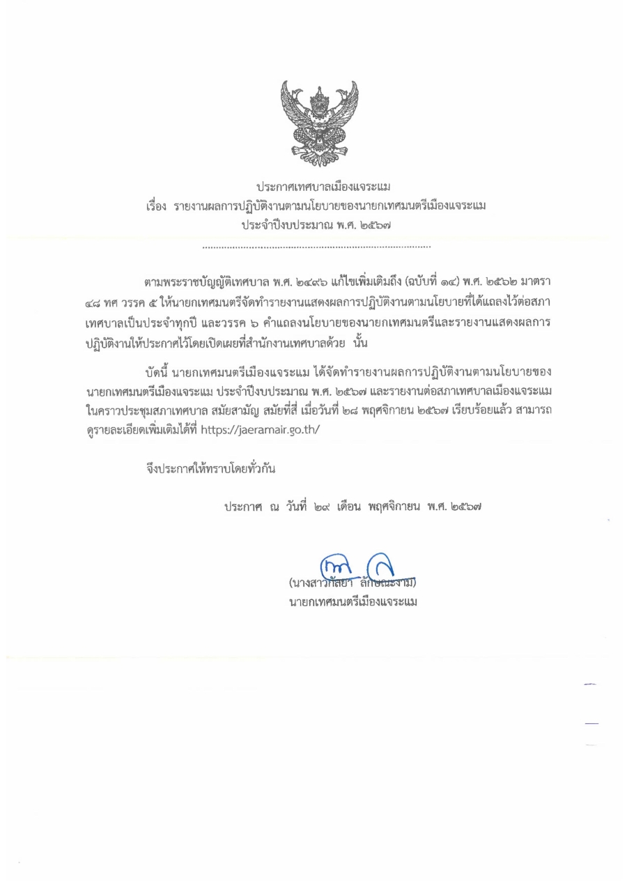 รายงานผลการปฏิบัติงานตามนโยบายของนายกเทศมนตรีเมืองแจระแม ประจำปีงบประมาณ พ.ศ. 2567